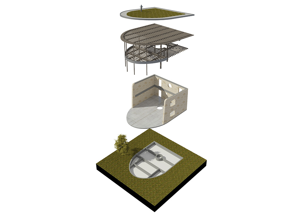Approche environnementale : Aboutissement de connaissances et de recherches sur la matière présente dans le Languedoc. cette villa répond aux besoins d’une capitaine de navire à la retraite. L’emprise au sol devait être maîtrisée sans aucune suppression d’arbre. La matière optimisée, appliquée en fonction de ses caractéristiques propres. - la coque en pierre calcaire de Beaulieu, calepinée à l’échelle d’une habitation, enveloppe et protège les espaces intérieurs. - Le squelette en bois Douglas de Florensac structure les usages et oriente les ouvertures.