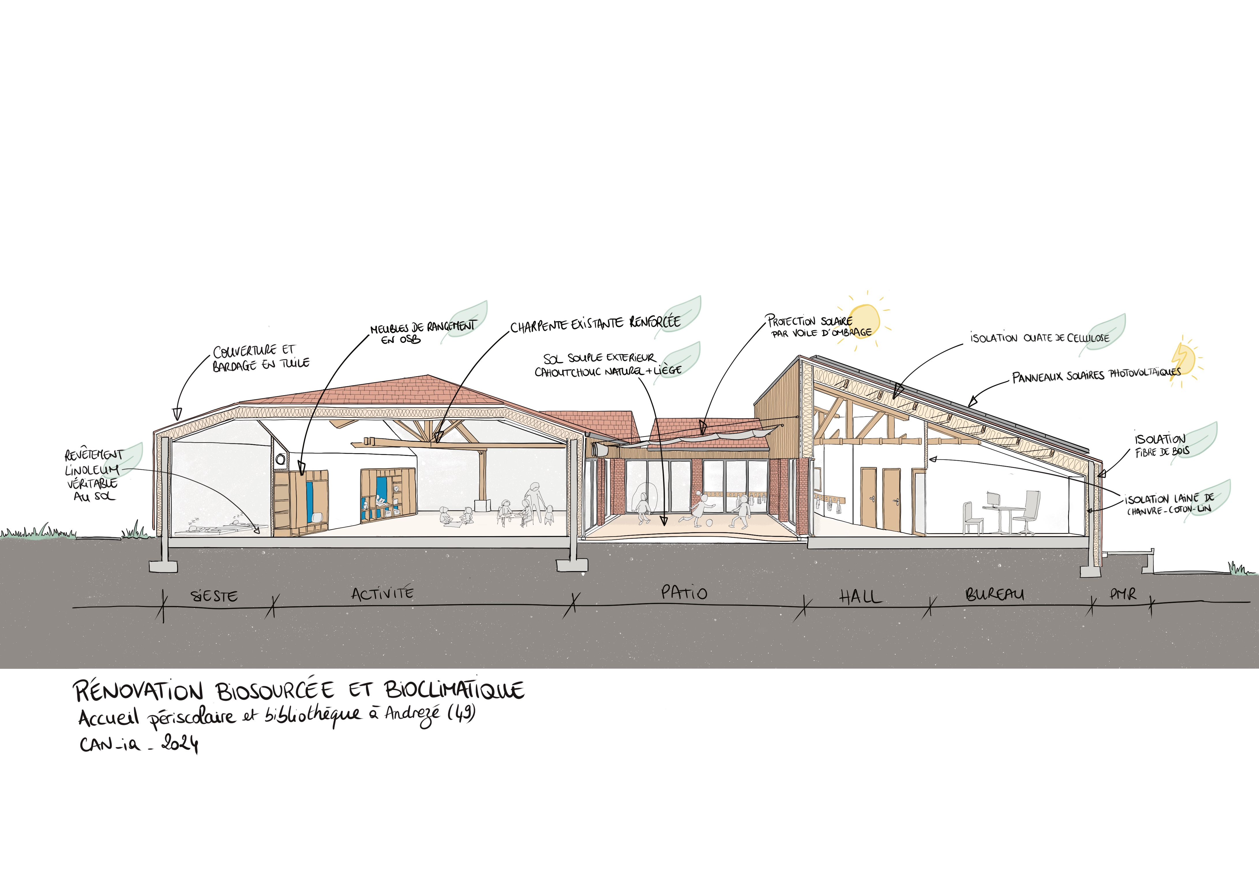 Le centre périscolaire d’Andrezé, à Beaupréau-en-Mauges, accueille les enfants des écoles publiques et privées en dehors des heures de classe et pendant les vacances. Il est divisé en deux pôles selon l’âge. Le bâtiment, initialement prévu pour une salle des fêtes puis une cantine, a été réorganisé pour améliorer ses performances thermiques et son accessibilité. Une partie accueille une bibliothèque municipale avec entrée indépendante. La rénovation suit une démarche bas carbone avec des matériaux biosourcés et des énergies renouvelables (panneaux photovoltaïques, chaufferie bois).