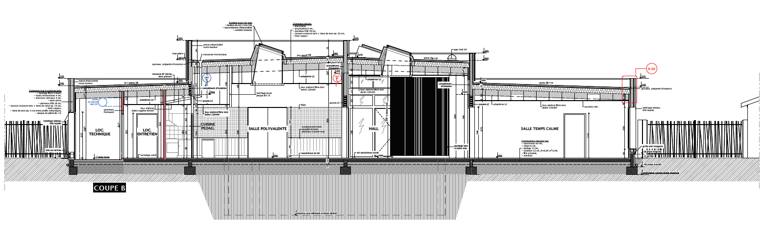Approche environnementale : Construction ossature bois isolée laine de roche et laine de bois. Démarche bioclimatique mettant en oeuvre une recherche de mise à profit des apports solaires gratuits, une VMC double flux et pompe à chaleur. Travail au sujet de la qualité de l'air intérieur : sol caoutchouc naturel, parement bois intérieur, faux plafond fibre végétal. Mise en place de deux pergolas bioclimatiques à l'est et au sud du bâtiment.