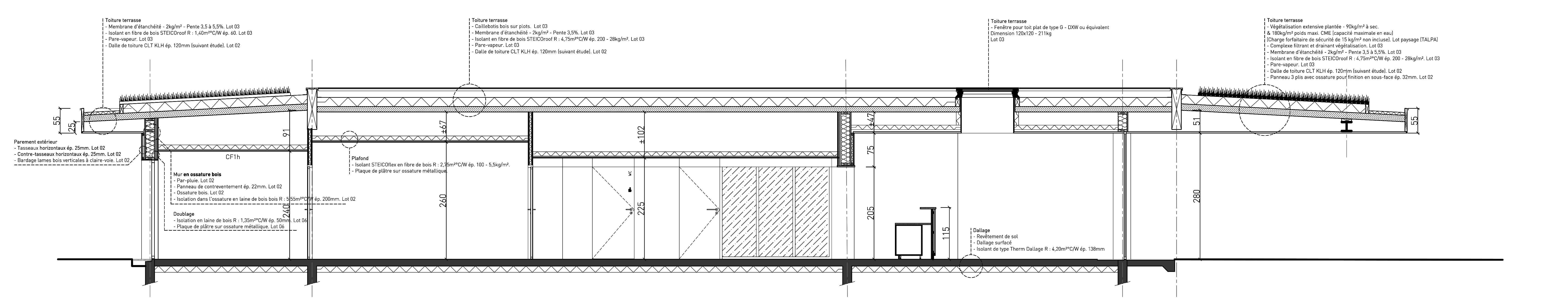 Descriptif technique : Le bâtiment est réalisé en façades et murs à ossature bois avec isolation laine de bois. La toiture est en panneaux CLT porteurs et poutres lamellé collé. Les sous-faces des débords de toiture en extérieur, de même que les faux-plafonds intérieurs, sont en panneaux 3 plis épicéa, acoustiques pour l’intérieur. Le bardage en lames bois châtaignier verticales ton brun-noir habille l’extérieur mais aussi l’intérieur du bâtiment. Un bandeau périphérique en bois massif saturé blanc ceinture la dalle formant toiture et coiffe les élévations en bardage ton sombre. Le mobilier en contreplaqué d’épicéa. Les 2/3 de l’isolation sont en laine de bois. Système de chauffage : pompe à chaleur / climatisation réversible. Ventilation double-flux. Revêtement de sol en caoutchouc naturel de marque Nora.