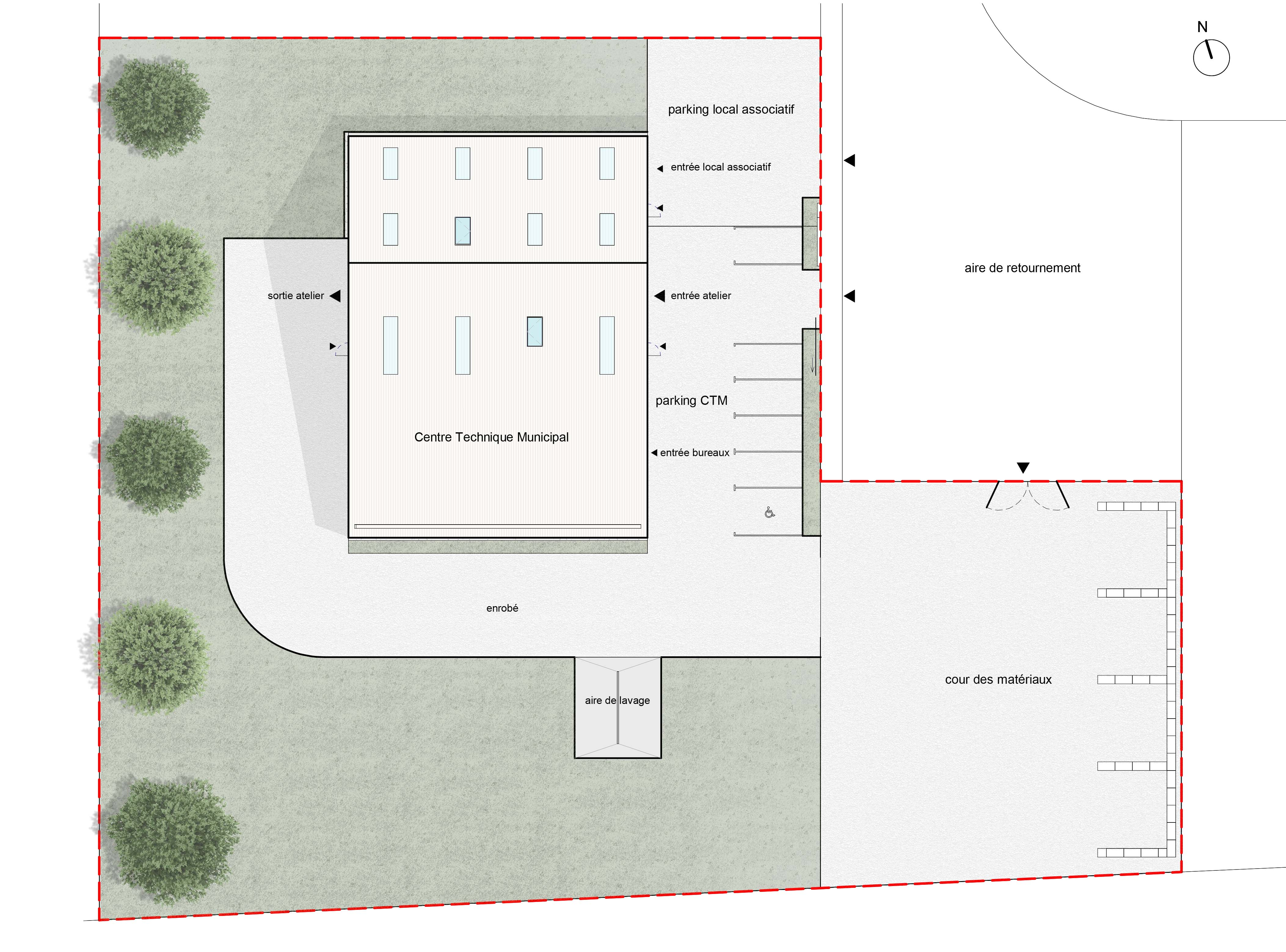 Le Centre Technique Municipal présente une volumétrie sobre et compacte, caractérisée par une toiture à deux pentes asymétriques. Son volume en acier laqué blanc accueille, en son cœur, un grand atelier ainsi qu’un espace de stockage destiné aux associations. L’atelier est équipé de deux grande portes sectionnelles situées de part et d’autre, facilitant une circulation intérieure des véhicules à sens unique. La partie regroupant les bureaux et les vestiaires se distingue quant à elle par ses façades en bois et semble s’insérer sous la grande toiture de l’atelier.