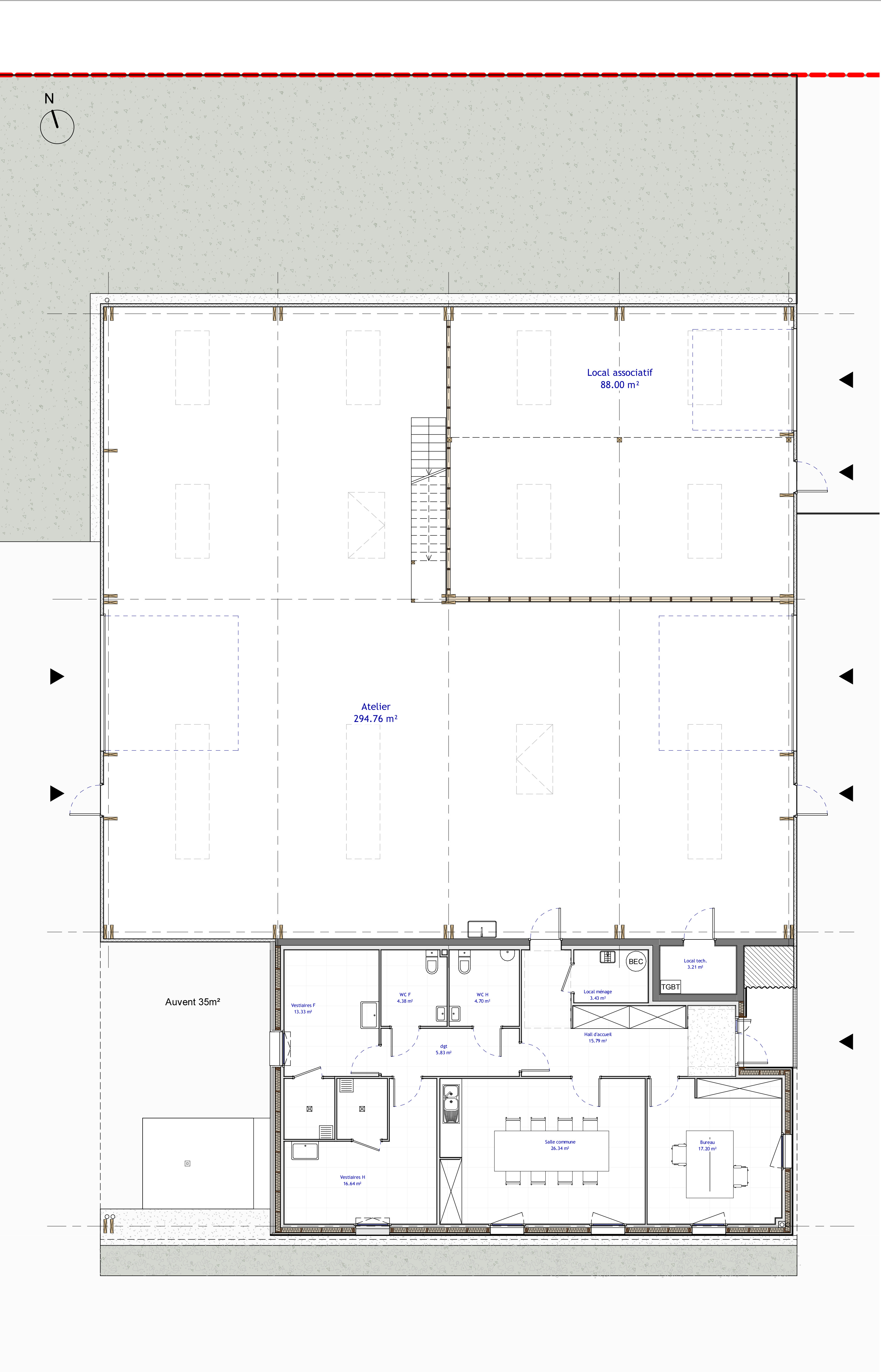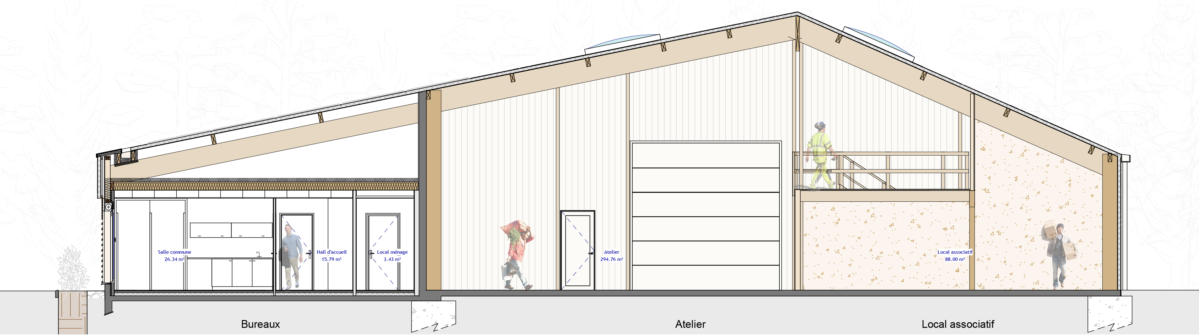 Descriptif technique : Charpente lamellé-collé pour l’atelier et l’espace de stockage associatif ; Murs Ossature bois pour la partie bureaux et vestiaires. Bardage bois Douglas Isolation : laine minérale ECS : Ballon thermodynamique VMC : simple flux Chauffage et Rafraichissement : PAC Air-Air /
