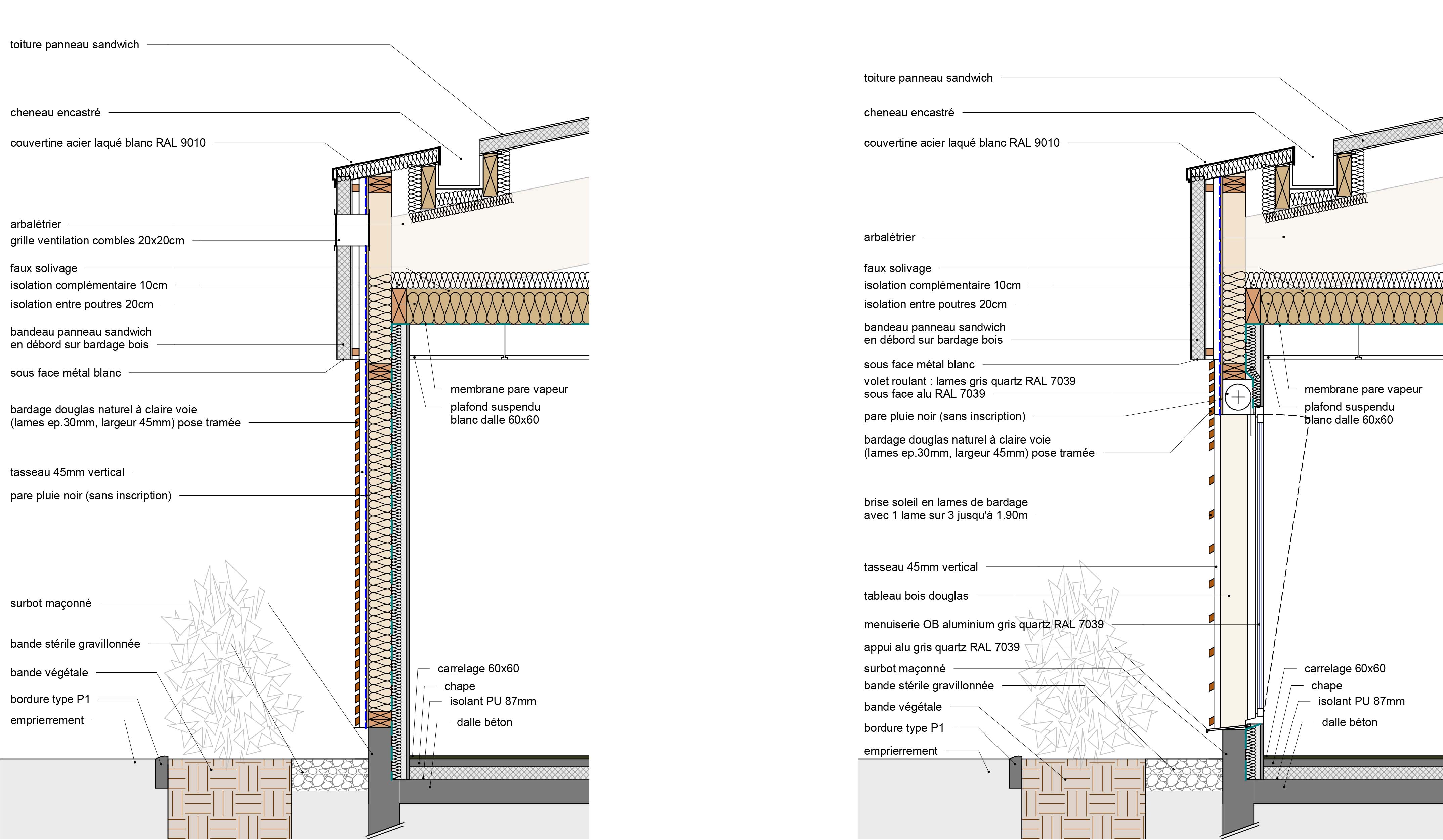 Approche environnementale : Le projet adopte une conception compacte, limitant l’imperméabilisation du site. La toiture est spécifiquement conçue pour accueillir des panneaux photovoltaïques, avec une orientation et une inclinaison idéale pour maximiser la captation de l’énergie solaire. L’utilisation combinée de matériaux tels que le bois pour la structure et l’acier pour l’enveloppe vise une approche durable et esthétique : Le bardage en bois horizontal, prolongé devant les fenêtres, joue un rôle de brise-soleil diminuant les apports de chaleur tout en offrant une sécurité renforcée des locaux.