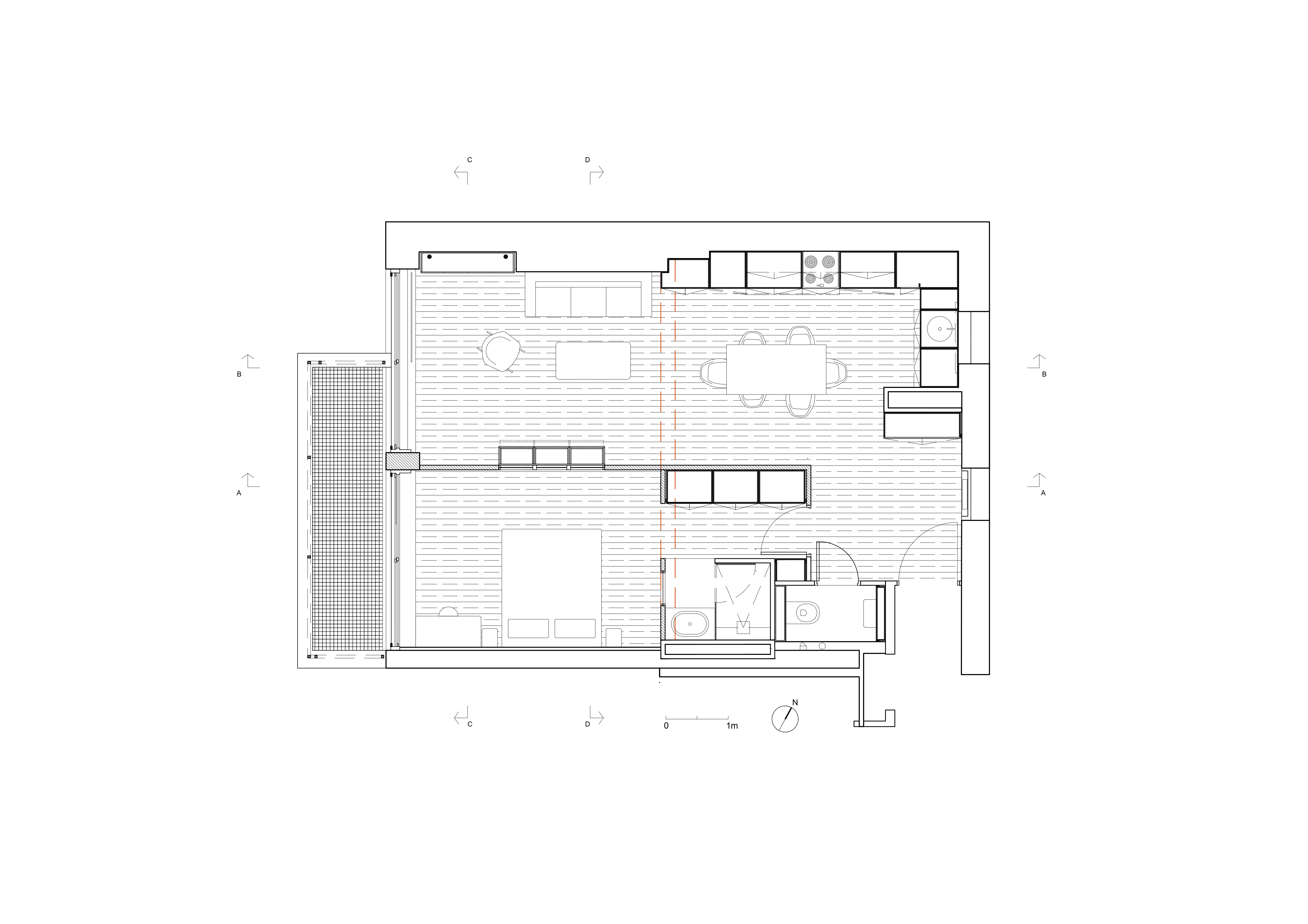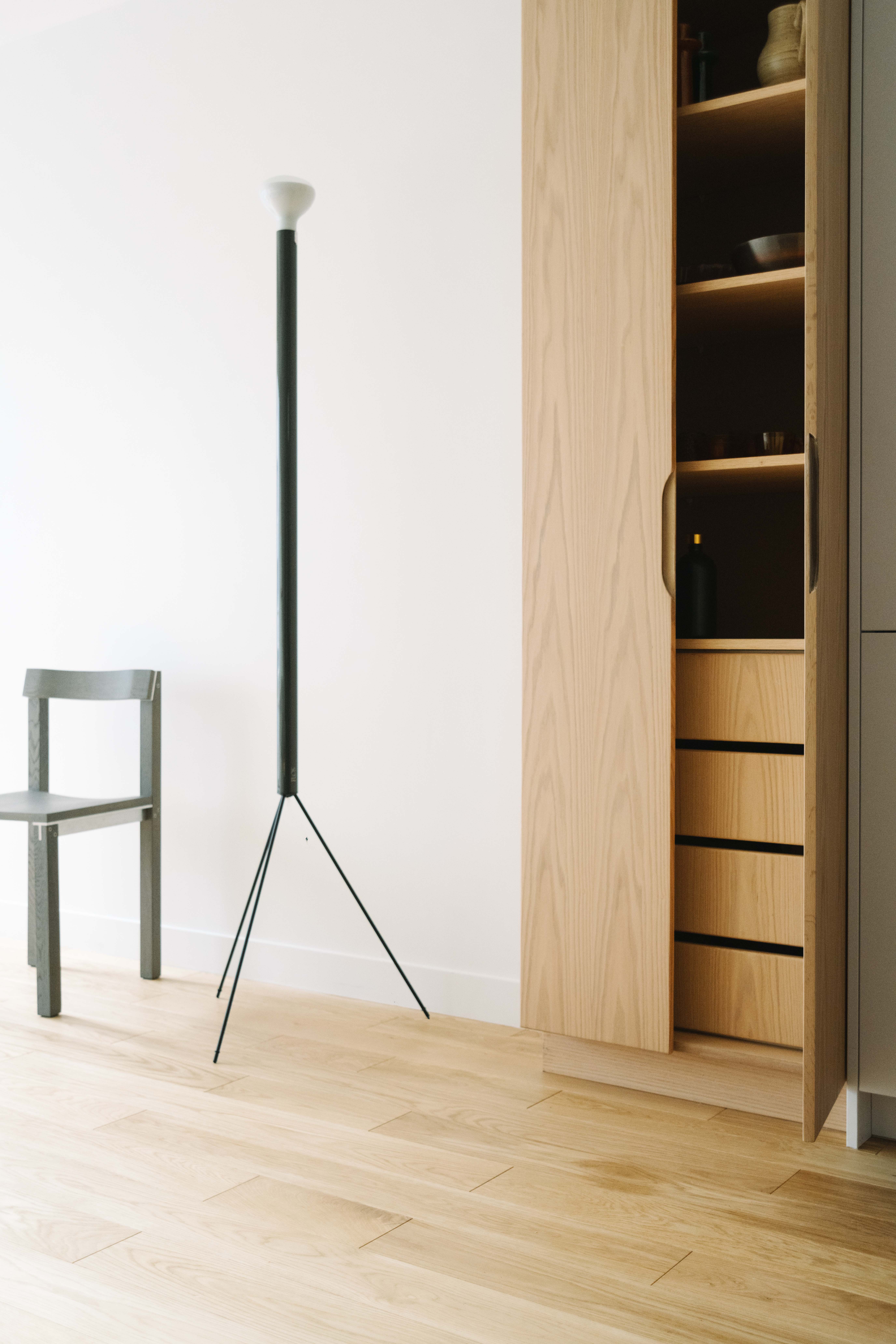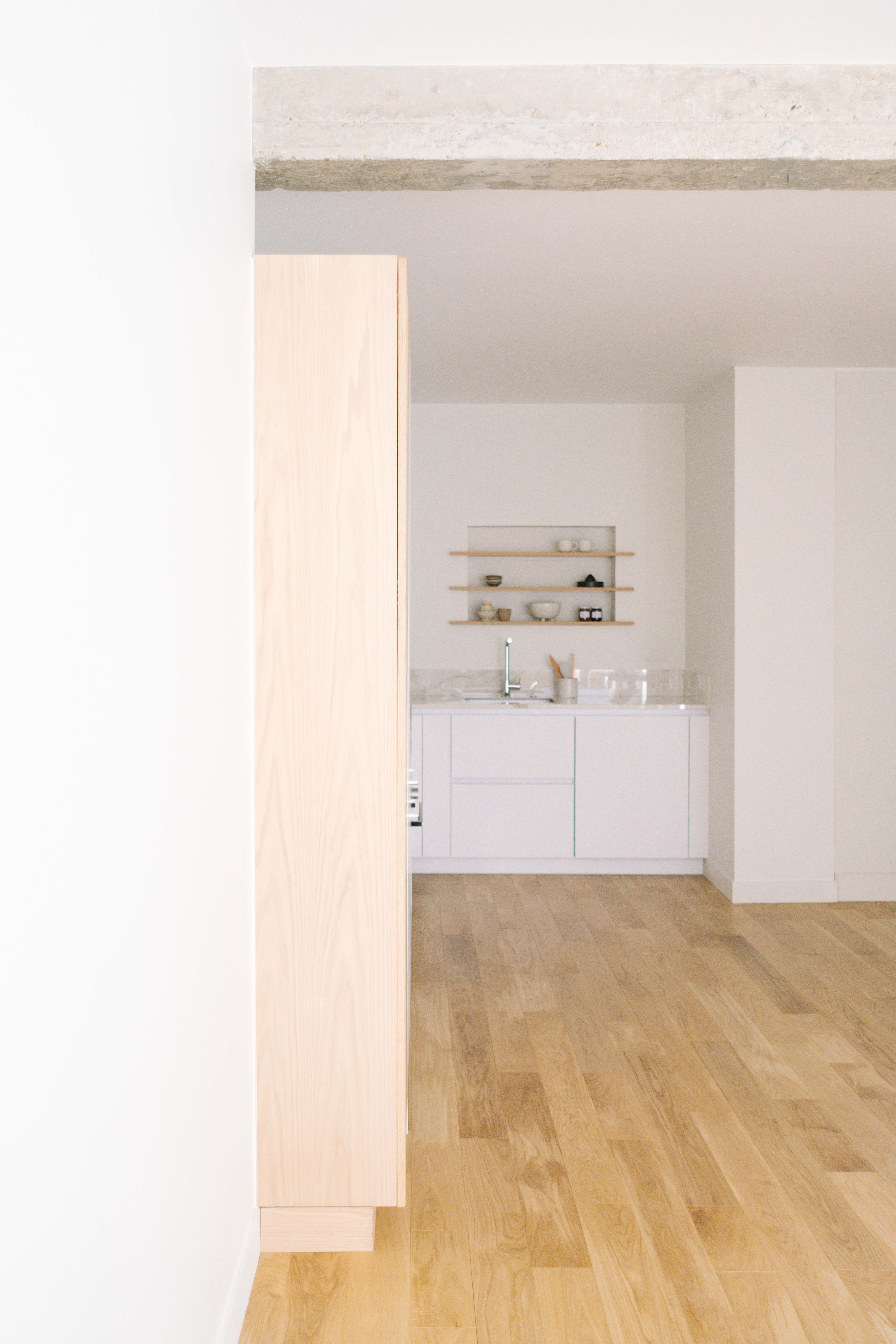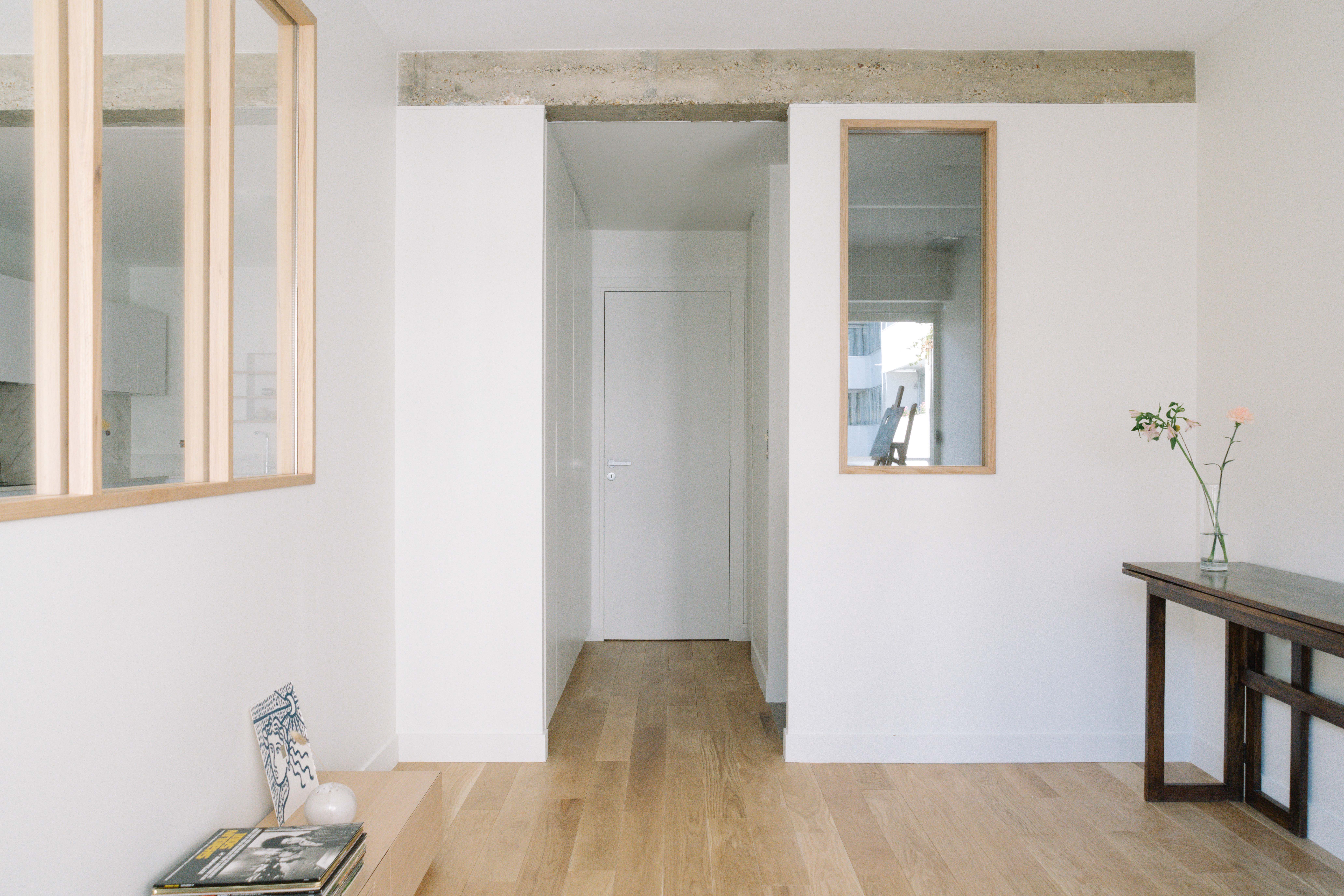 La rénovation de cet appartement des années 1950 établit un dialogue entre sa structure originelle et les interventions contemporaines. L’intervention révèle les matériaux d’origine : béton armé, briques de remplissage et pierre de moellon. Un mur en pierre restauré et une poutre traversante, mis en valeur, structurent l’espace et en définissent les usages. Des aménagements sur mesure en chêne massif rythment les lieux, optimisant la circulation. Une niche en pierre accueille un bar qui épouse ses irrégularités, détaché des parois et reposant sur son socle en marbre d’origine.