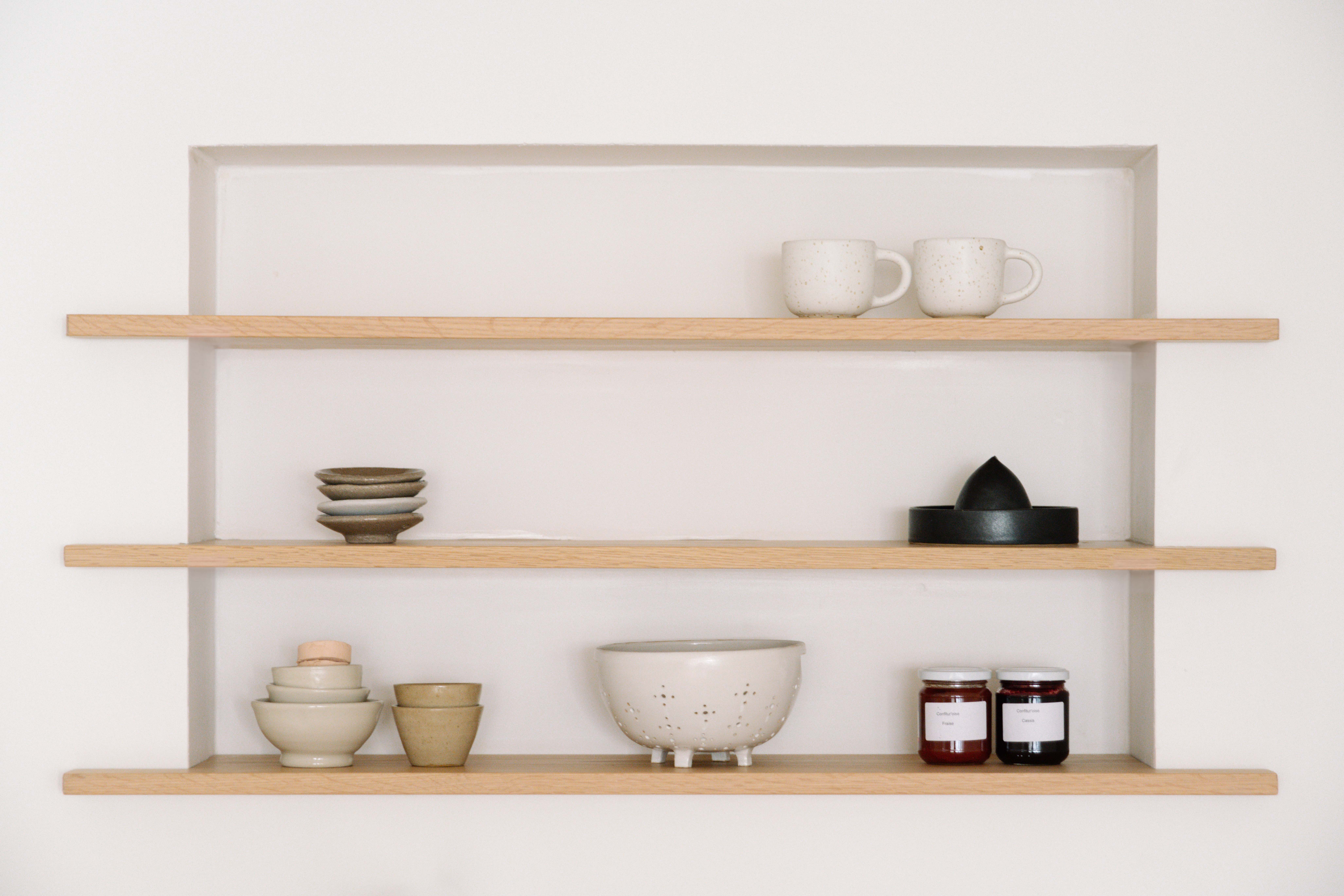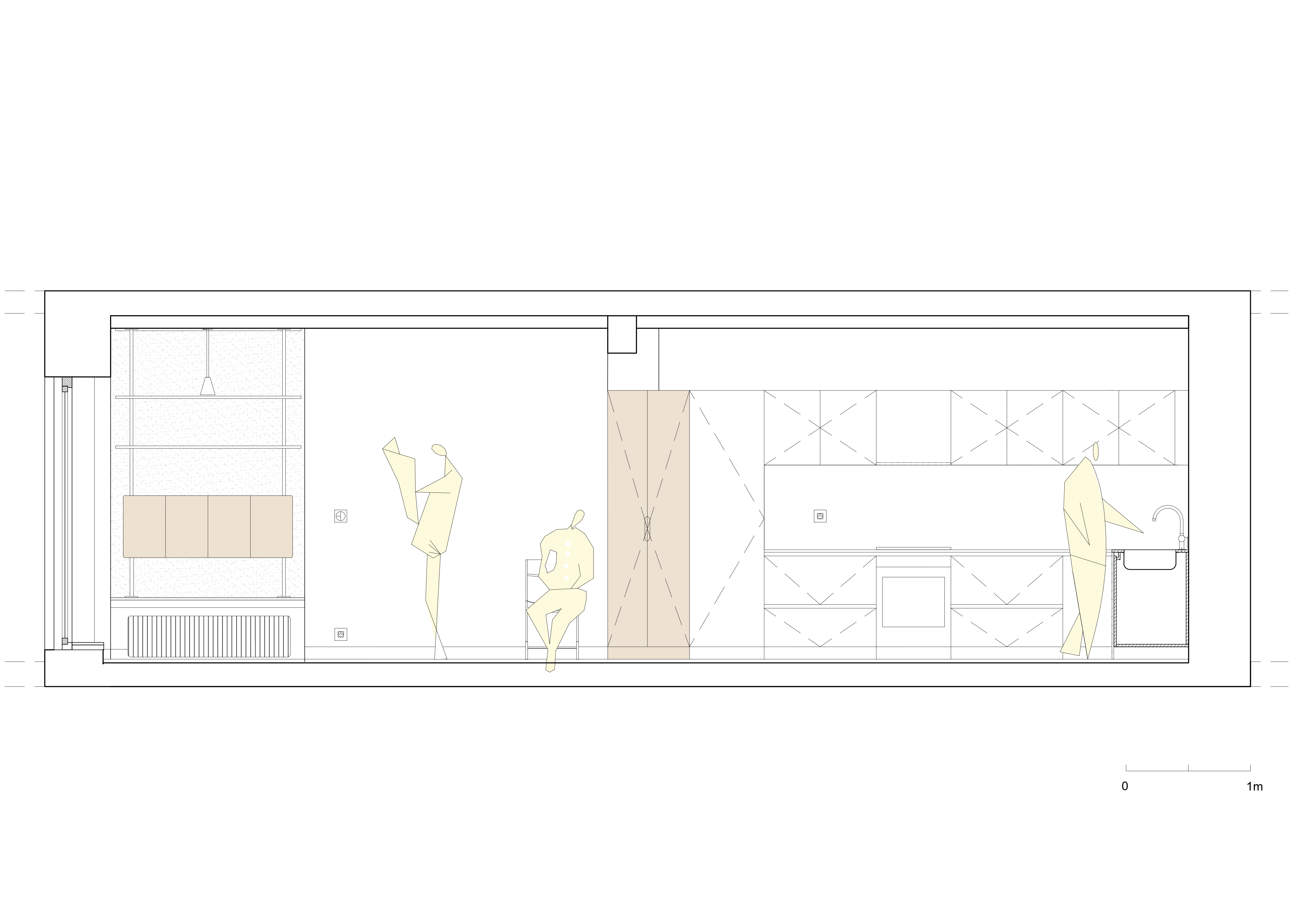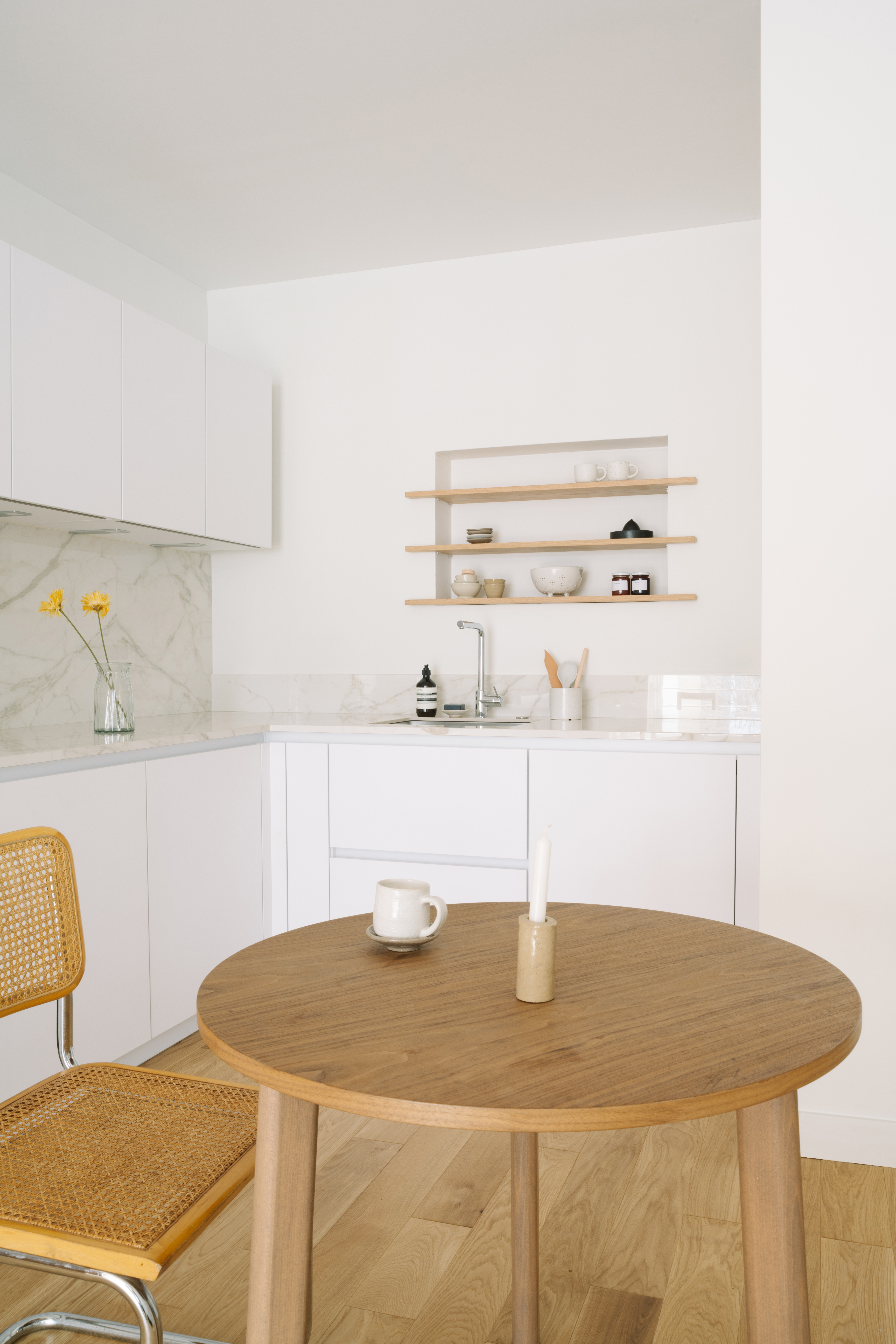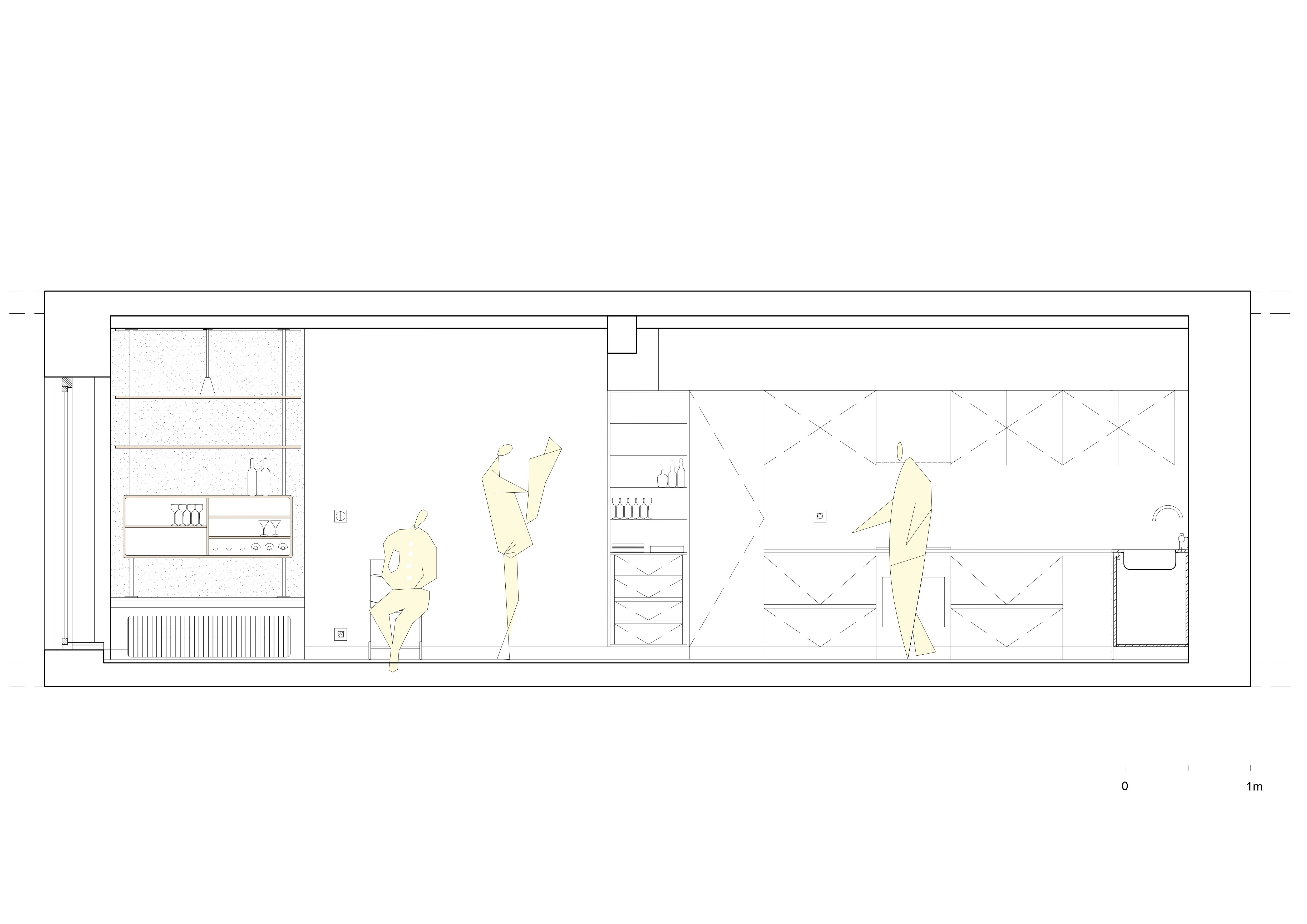 La rénovation de cet appartement des années 1950 établit un dialogue entre sa structure originelle et les interventions contemporaines. L’intervention révèle les matériaux d’origine : béton armé, briques de remplissage et pierre de moellon. Un mur en pierre restauré et une poutre traversante, mis en valeur, structurent l’espace et en définissent les usages. Des aménagements sur mesure en chêne massif rythment les lieux, optimisant la circulation. Une niche en pierre accueille un bar qui épouse ses irrégularités, détaché des parois et reposant sur son socle en marbre d’origine.