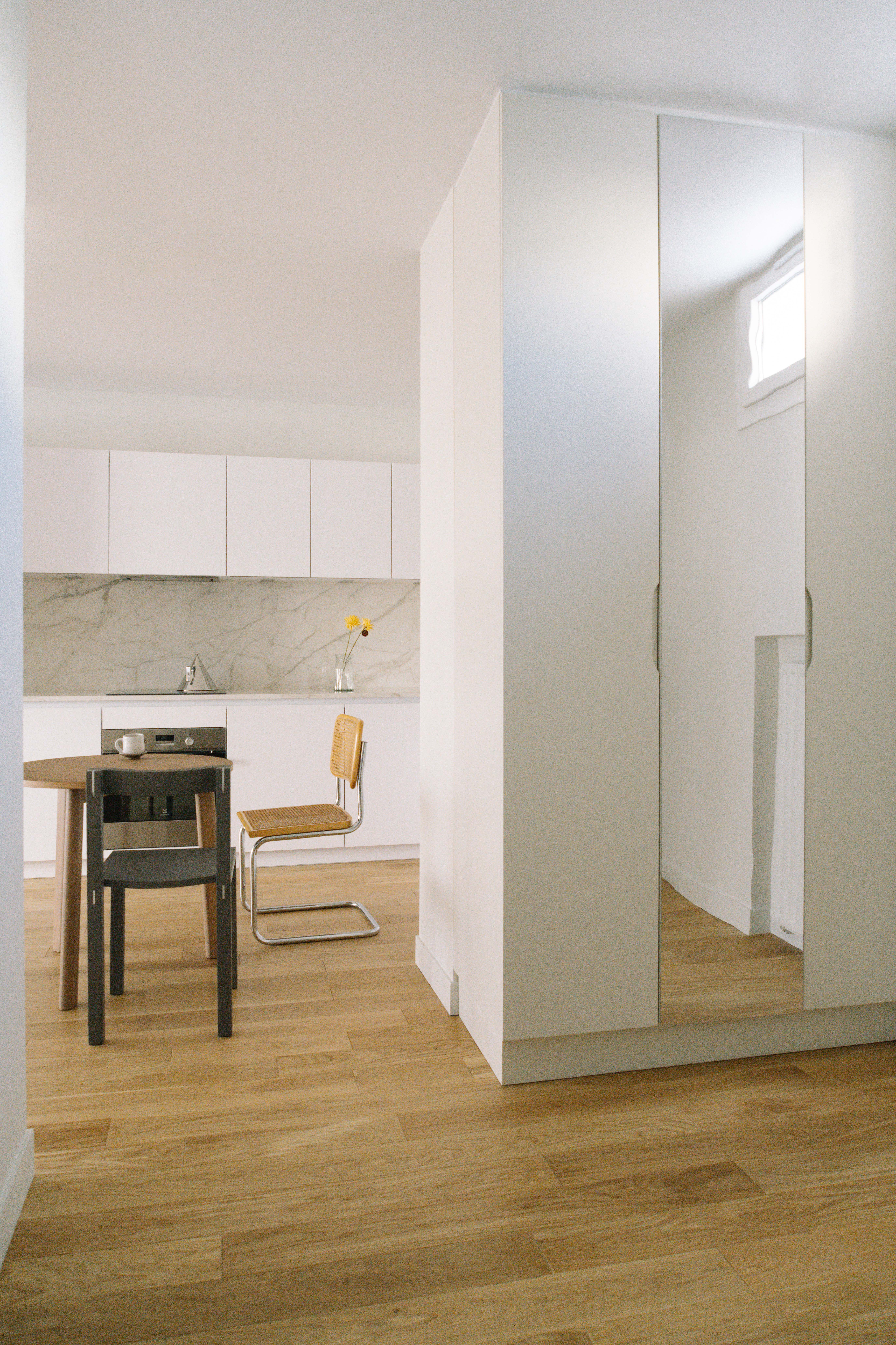 Approche environnementale : La conception favorise l’apport de lumière naturelle, une orientation optimisée et une ventilation traversante pour réduire les besoins énergétiques. L’inertie thermique est renforcée par un mur en pierre restauré, situé au sud-ouest de l’appartement, absorbant et restituant la chaleur. L’isolation fait appel à des matériaux aux performances thermiques et acoustiques élevées, combinant laine de bois et sous-couche de plancher issue du recyclage de pneus d’avion. L’éclairage naturel prédomine, complété par des dispositifs à faible consommation. Les matériaux biosourcés sont valorisés.