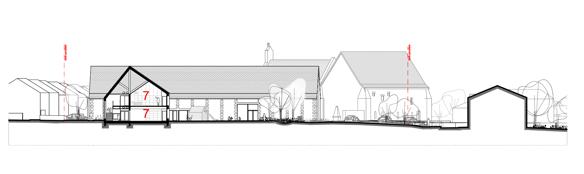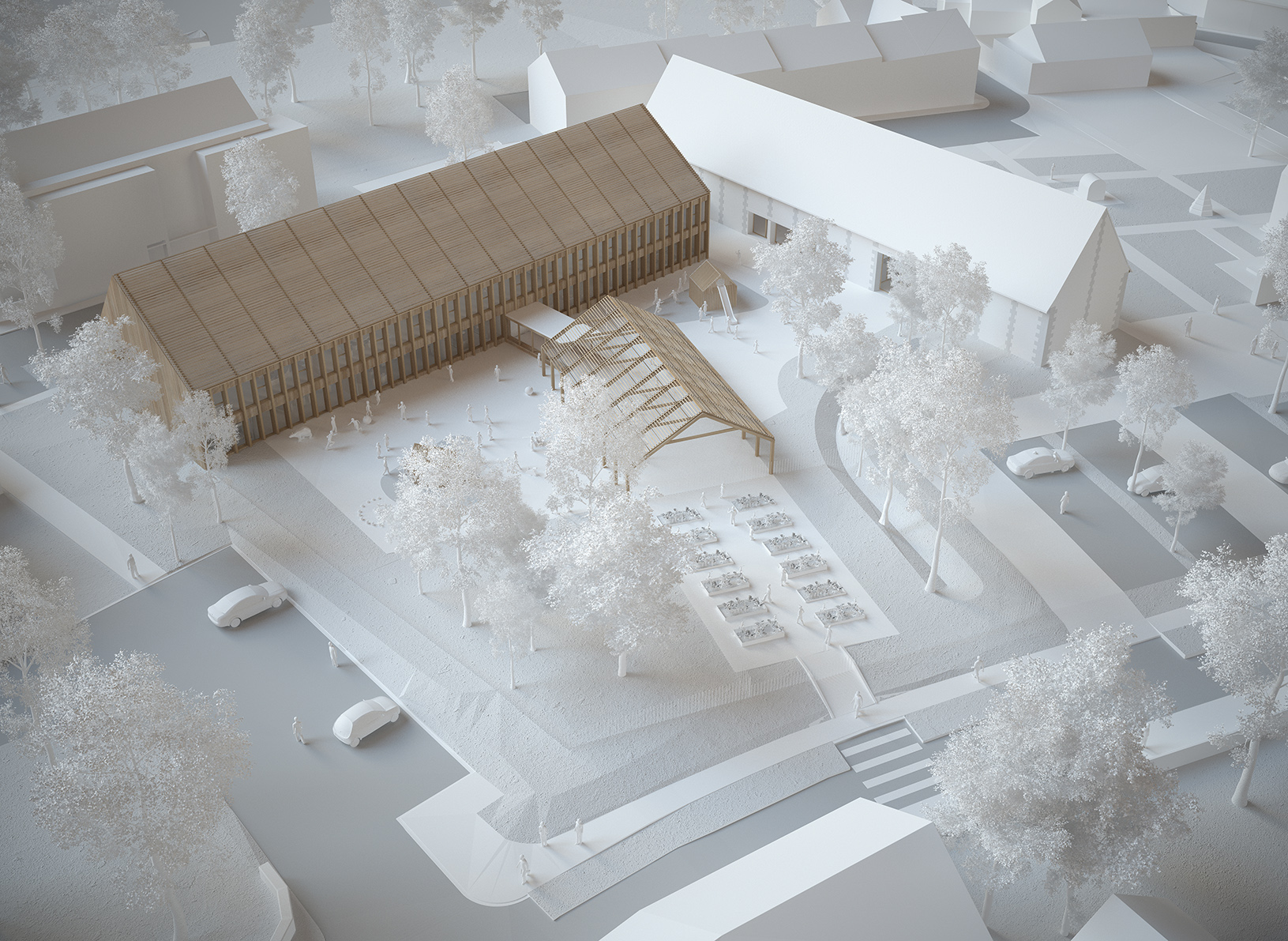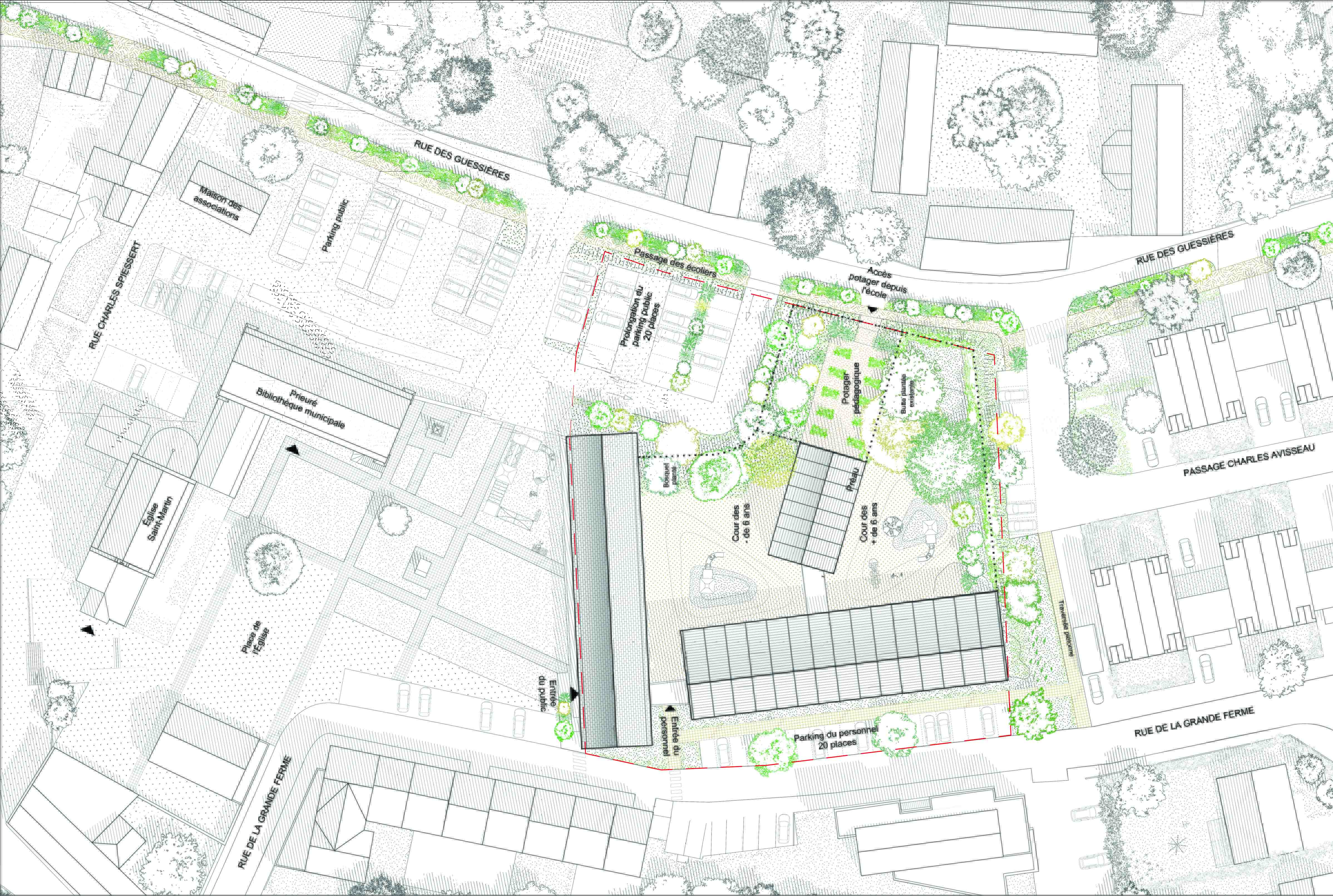Descriptif technique : Le projet propose de réhabiliter la grange en salle polyvalente avec un minimum d’interventions pour conserver l’âme du bâtiment. L’extension contemporaine se démarque par son traitement en bois et verre, tout en respectant le gabarit et les règles de composition de la grange. L’extension s’implante dans une longère, perpendiculaire à la grange. L’articulation des deux époques s’effectue par un volume bas vitré. Libérée des masses bâties, la cour de récréation offre un cadre idéal au développement d'une biodiversité pédagogique à l’échelle du quartier. Le préau, halle ouverte en bois à toiture double pente, s’installe dans cet écrin de verdure. Détaché, il crée la 3e pièce du triptyque. Telle une ferme, chaque bâti se démarque par son usage.