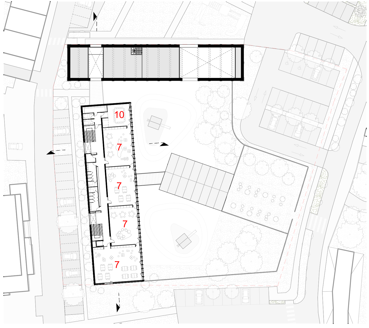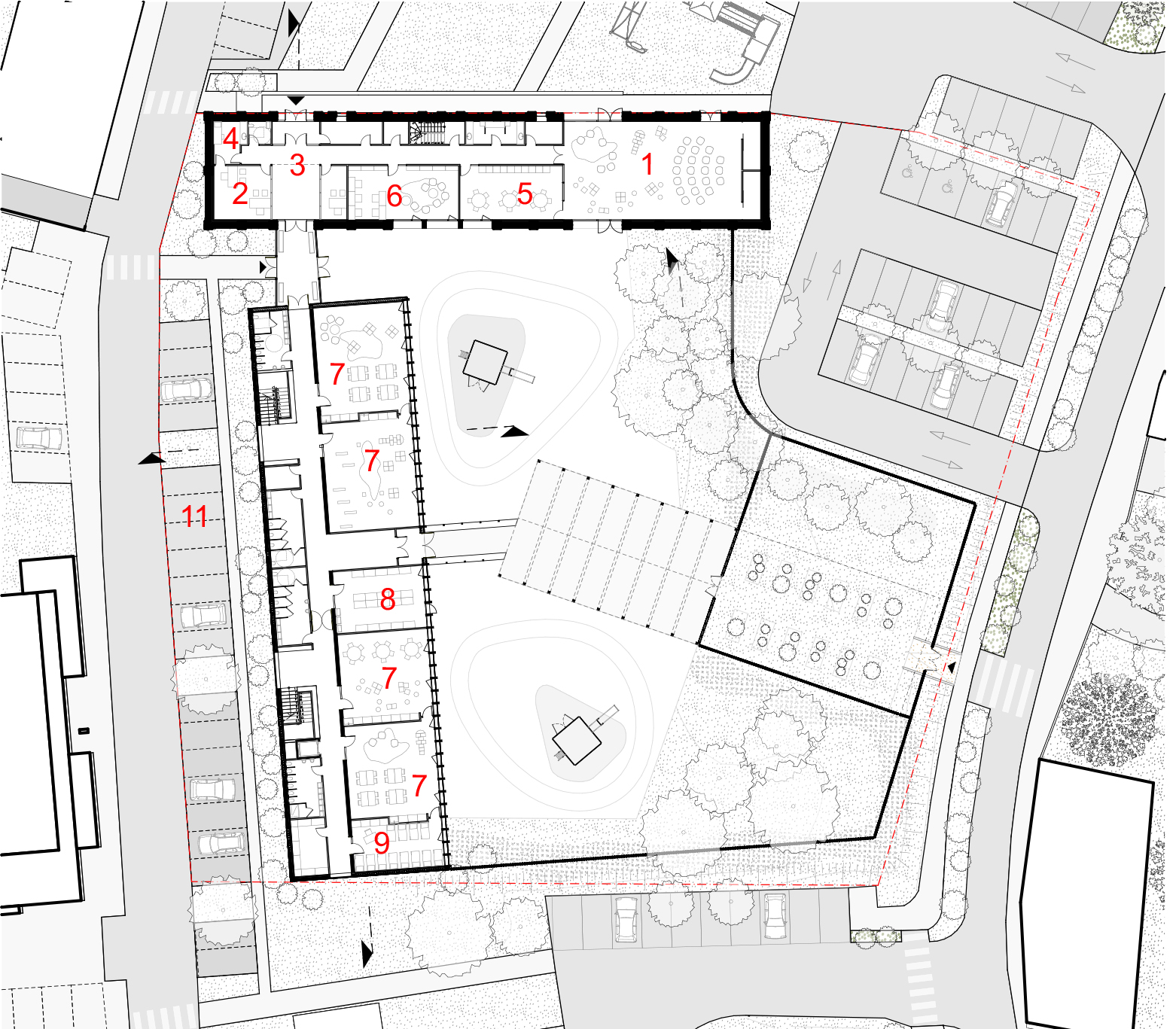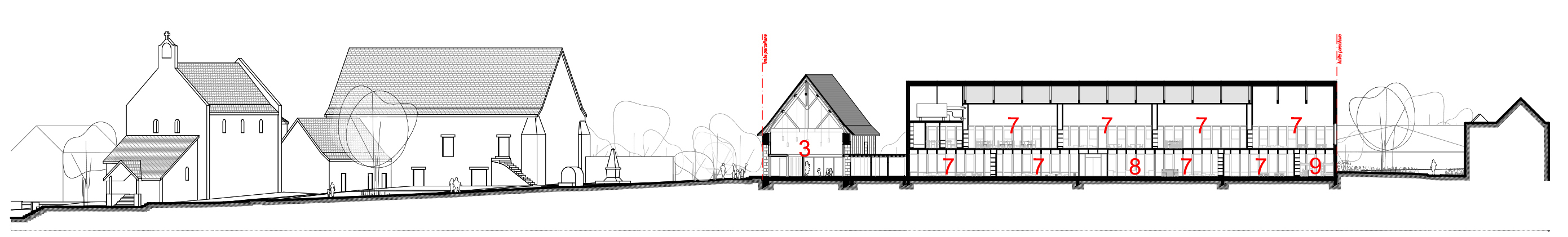 Descriptif technique : Le projet propose de réhabiliter la grange en salle polyvalente avec un minimum d’interventions pour conserver l’âme du bâtiment. L’extension contemporaine se démarque par son traitement en bois et verre, tout en respectant le gabarit et les règles de composition de la grange. L’extension s’implante dans une longère, perpendiculaire à la grange. L’articulation des deux époques s’effectue par un volume bas vitré. Libérée des masses bâties, la cour de récréation offre un cadre idéal au développement d'une biodiversité pédagogique à l’échelle du quartier. Le préau, halle ouverte en bois à toiture double pente, s’installe dans cet écrin de verdure. Détaché, il crée la 3e pièce du triptyque. Telle une ferme, chaque bâti se démarque par son usage.