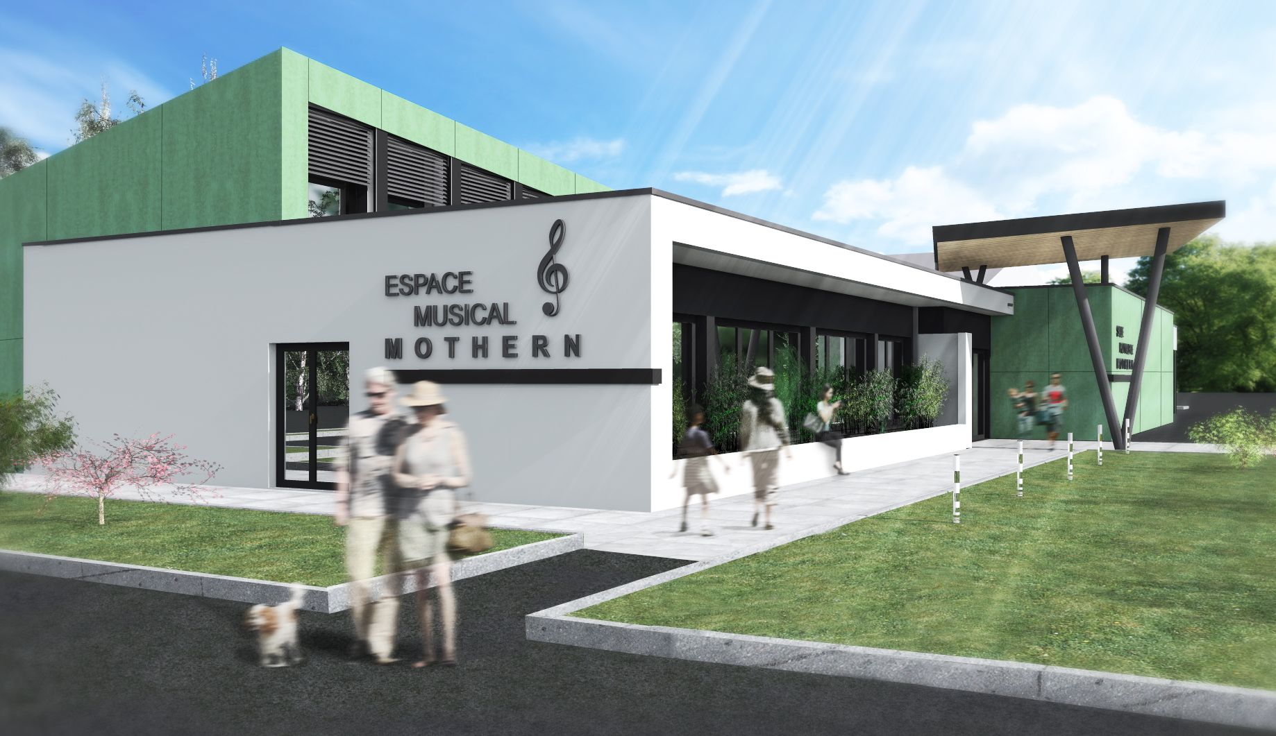 Approche environnementale : La forme et la volumétrie de l’extension sont dictées par le mariage les données acoustiques et bioclimatiques. C’est pourquoi, la façade sud est largement vitrée mais protégée par un débord de toit et des brises soleil orientables et que les salles de répétition sont asymétriques.