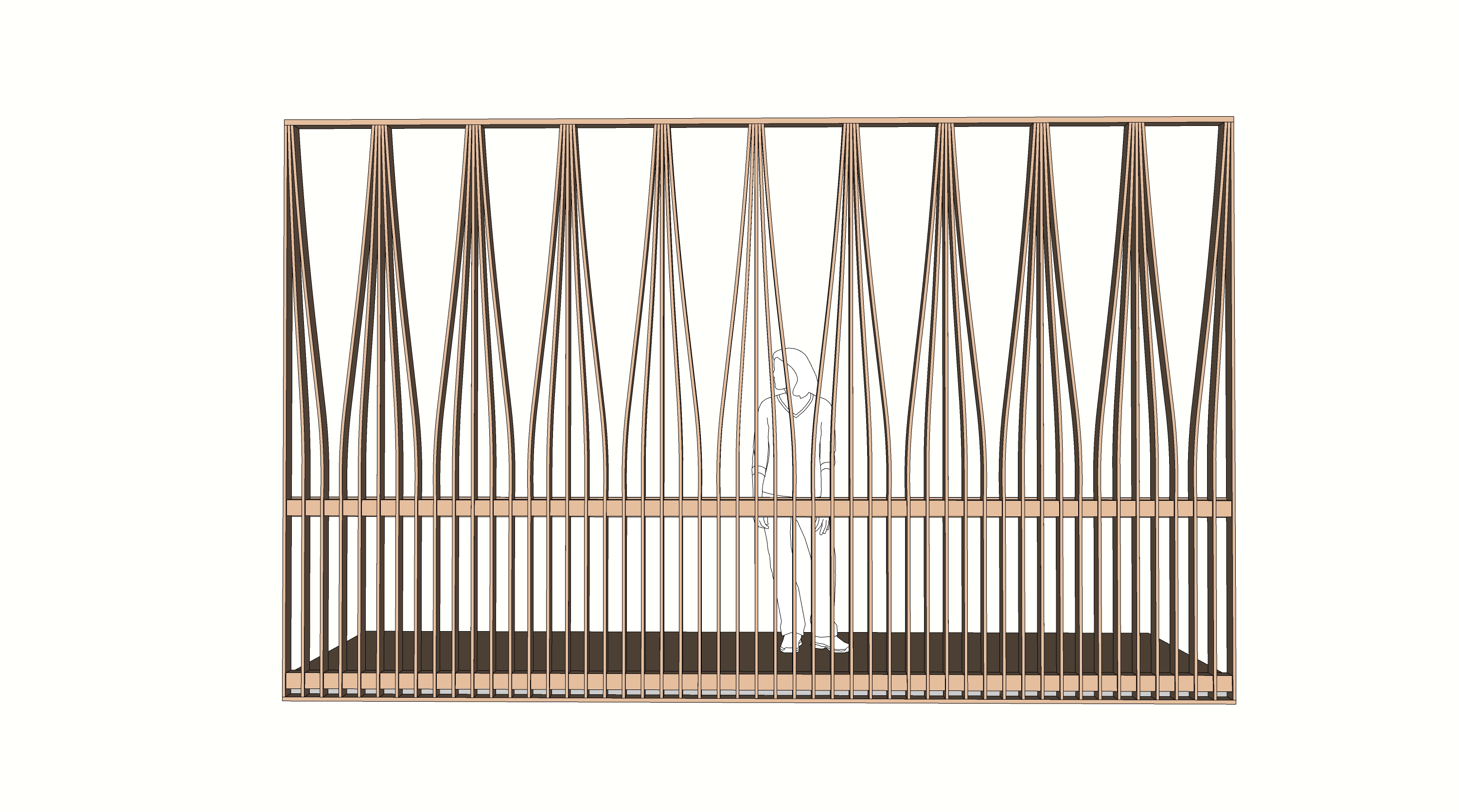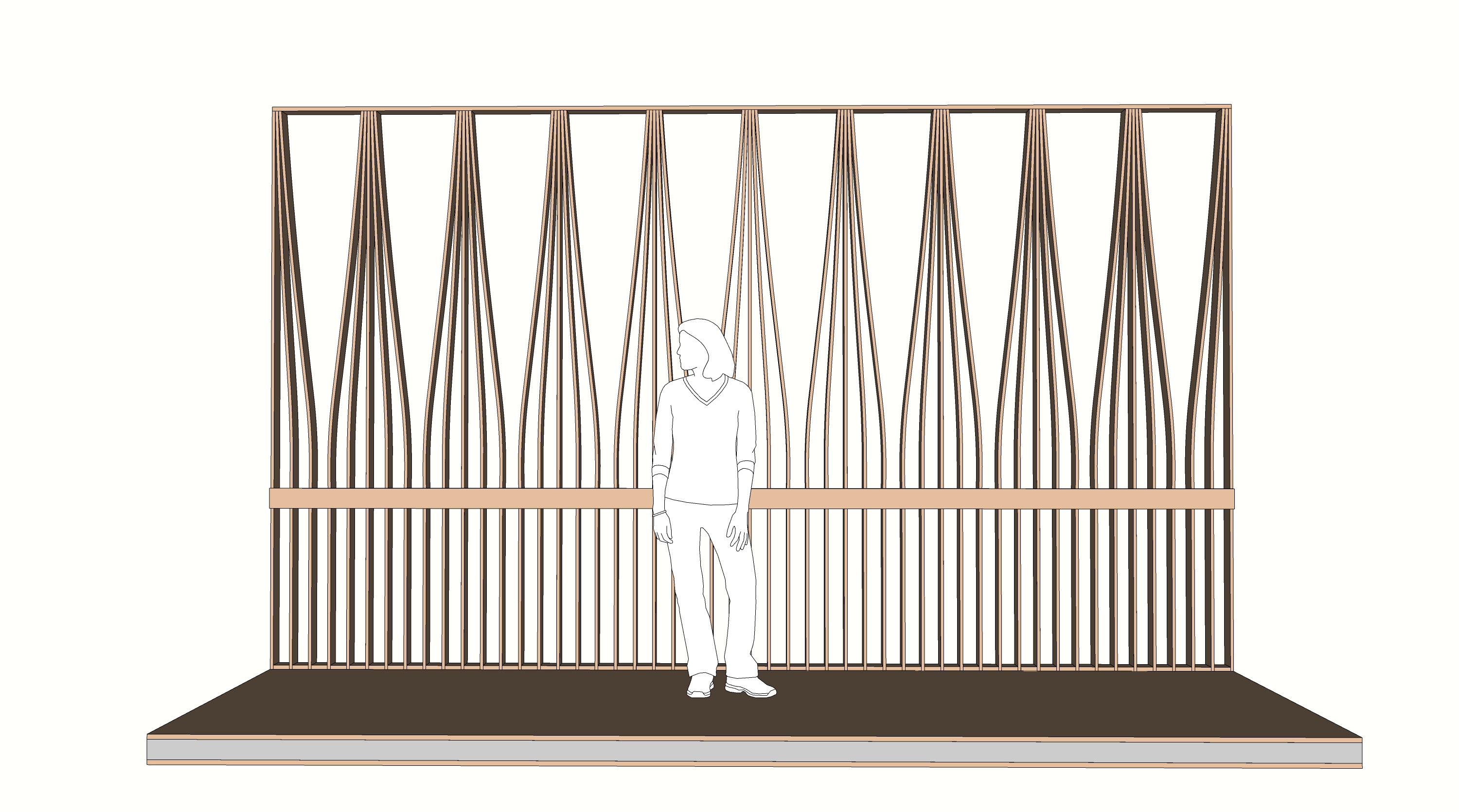 Descriptif technique de l'aménagement : Petit focus sur ce garde-corps que l'on cherchait à réaliser depuis un moment. Des planches d'épicéa suffisamment fines (15mm) pour être fléchies. Garde-corps en bas, et on écarte les lames en haut, pour voir au travers, comme dans les hautes herbes. Le plaisir de la courbe, naturelle qui tend les fibres et augmente leur rigidité. Notre ami Alexandre Hubert qui l'a construit avec d'autres amis. Il a pris du bois, non séché, chez un ami scieur Baptiste Menjoz à Charmois-devant-Bruyères. Mais quand les planches sont arrivées elles se sont avérées très chargées en traces de scolytes. On a hésité, puis on s'est dit : allez, on assume. Et c'est pour ça qu'on voit comme des traces d'encre, comme des estampes, sur les planches, qui rendent le bois encore plus unique.