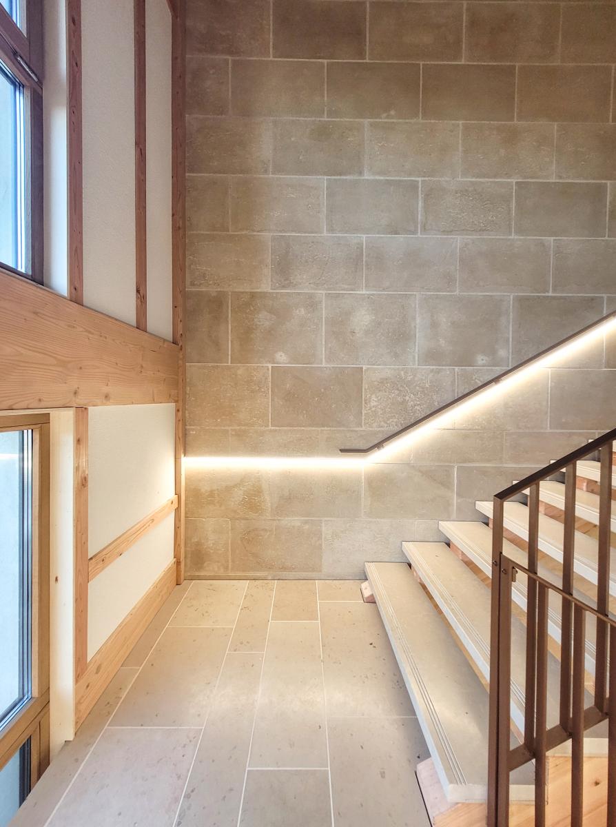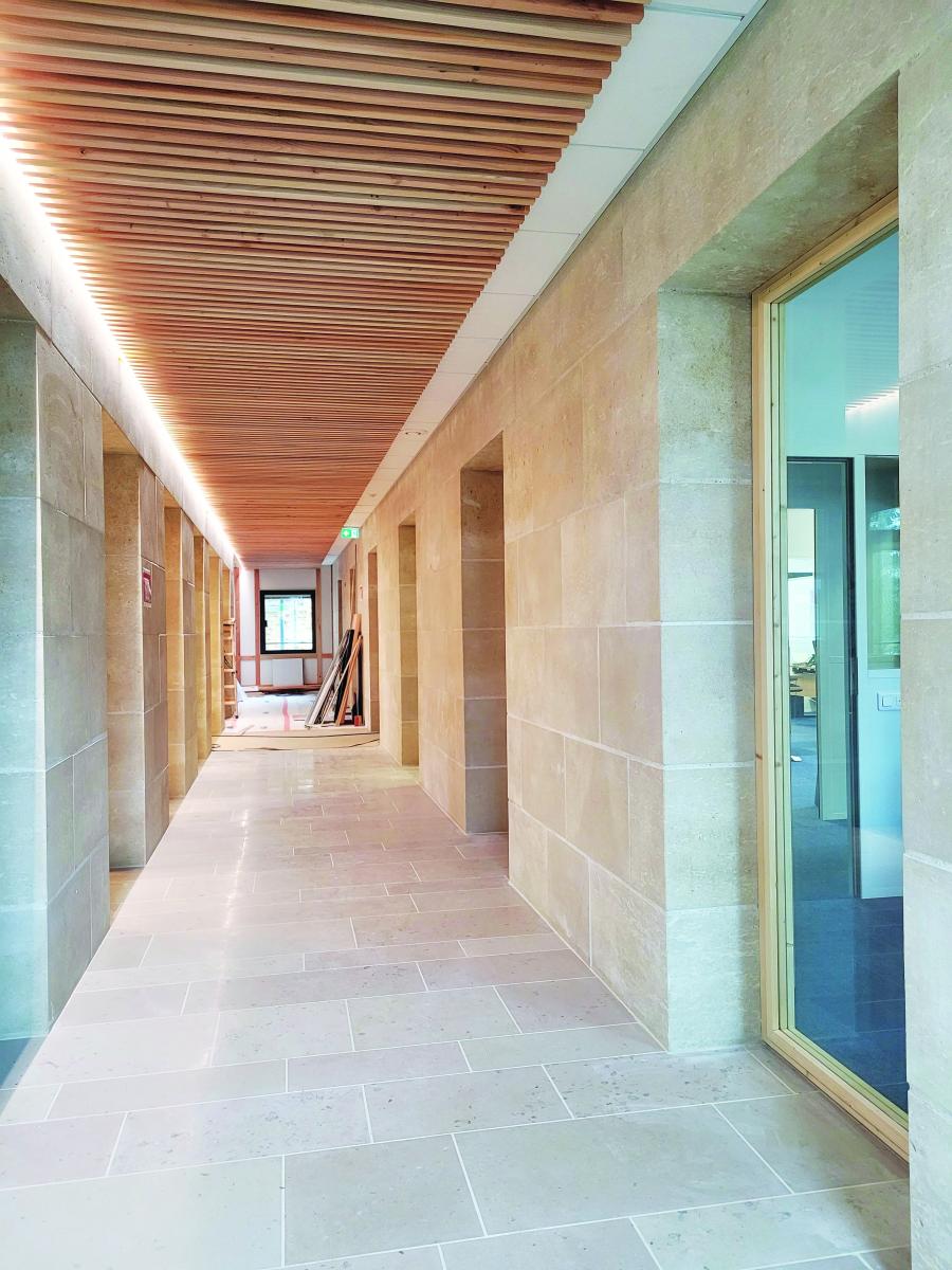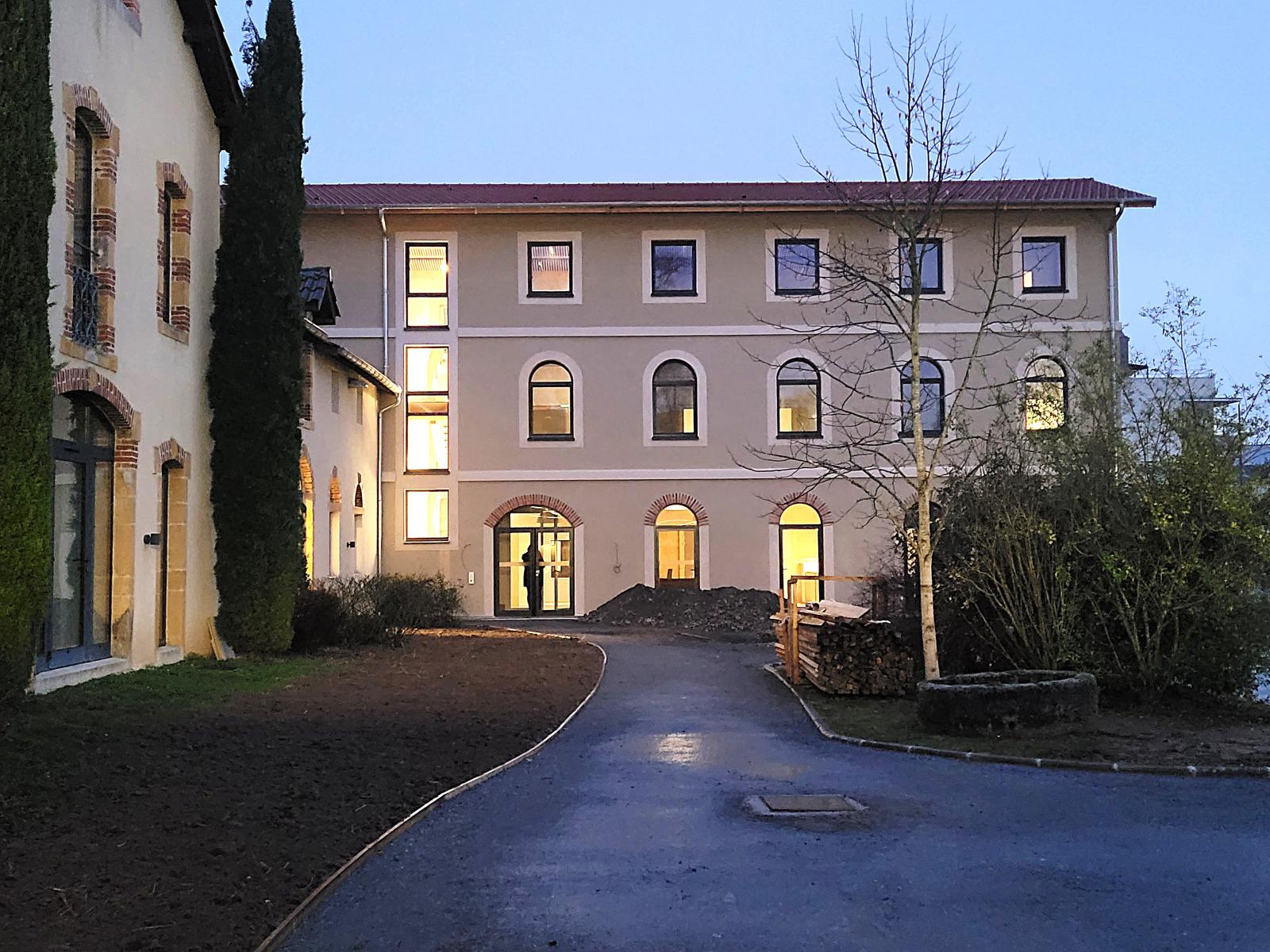 Approche environnementale : La conception LowTech limite les transformations des matériaux et les déchets. Compact, sur 3 niveaux, le bâtiment utilise la pierre pour l'inertie thermique et des murs extérieurs perspirants sans pare-pluie, sans pare-vapeur ni doublage. Les murs, caissons de toit, plafonds, … préfabriqués réduisent les manipulations sur site, les déchets, les nuisances pour ce chantier en site occupé et mitoyen d’un lycée. Les dimensions du bâtiment sont adaptées aux longueurs et sections possibles avec nos arbres locaux. Le projet privilégie les assemblages à sec pour faciliter la déconstruction future.