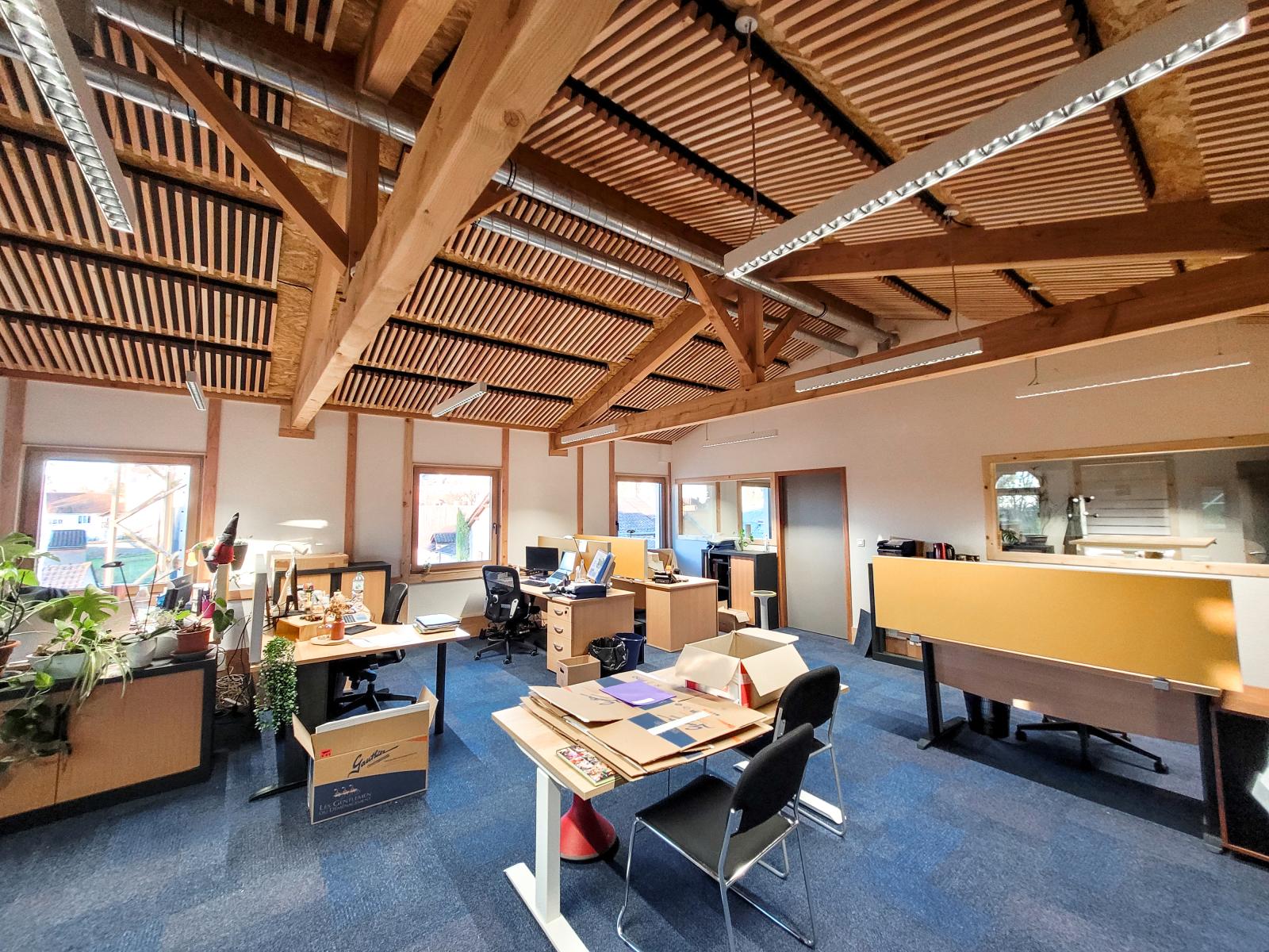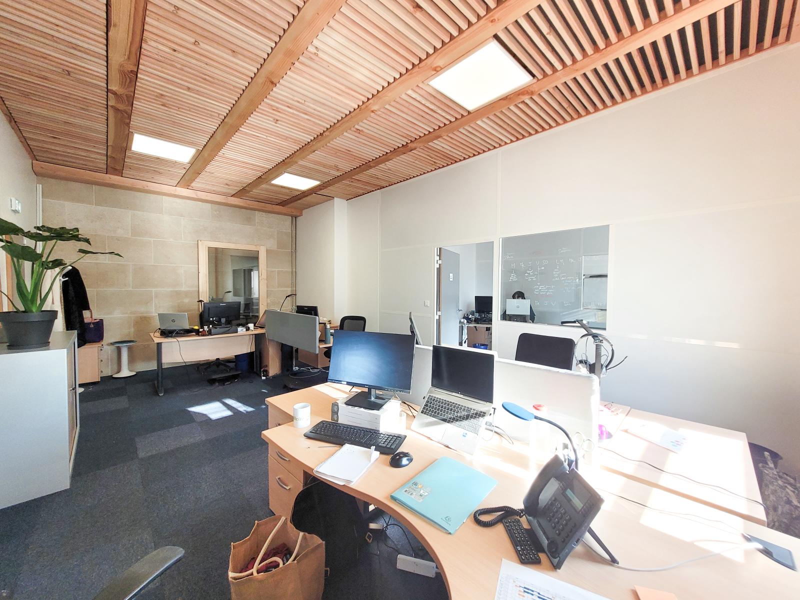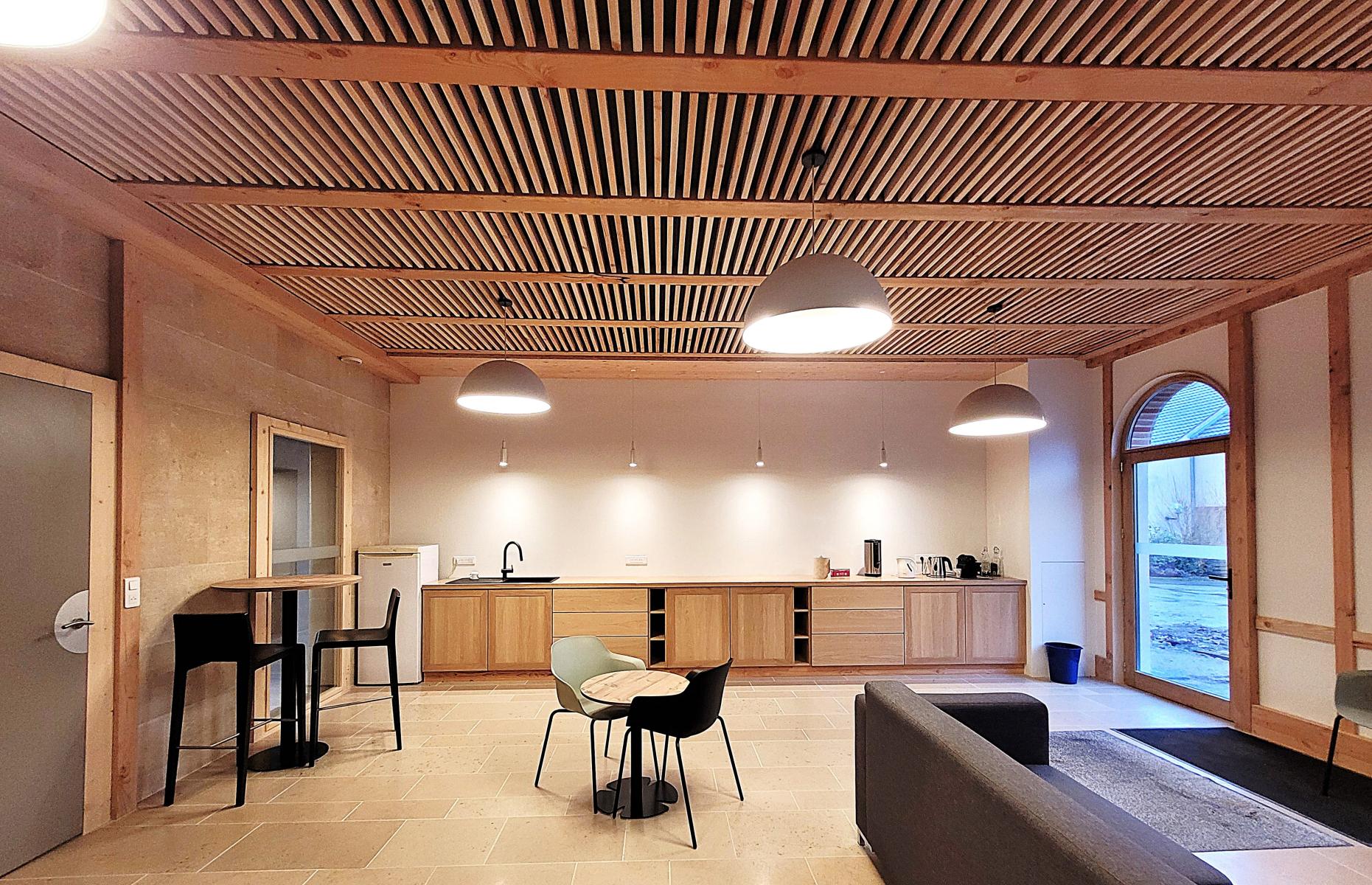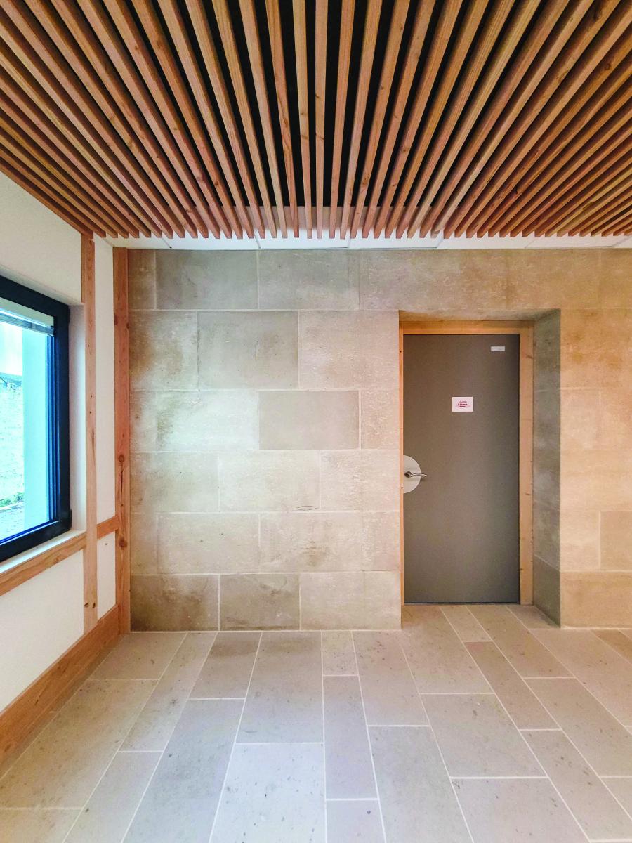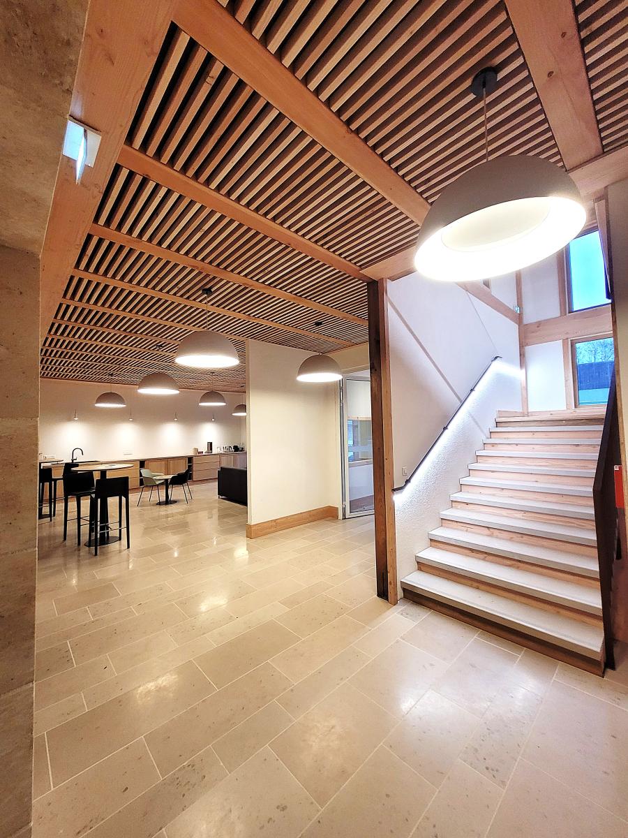 Descriptif technique : Les matériaux choisis ont un impact positif sur la qualité de l'air : murs perspirants, enduits chaux, bois non traité, matériaux et mobiliers de réemploi, … . Les murs en pierre naturelle minimisent le besoin de chauffage et conservent la fraîcheur en été. Une centrale double flux assure le rafraîchissement nocturne. Le projet intègre de nombreux matériaux de réemploi, sourcés par Bobi réemploi et Julie Herrgott, puis validés par le contrôleur technique, réduisant l'empreinte écologique : solives, poteaux, moquettes, cloisons, portes, vitrages, isolation, radiateurs, luminaires, sanitaires, faux-plafond, … . Pour exemple, les plafonds bois acoustiques Sylvacoustik sont fabriqués localement (69), en filière courte et vertueuse, à partir de chutes de sciage et de matériaux de réemploi.