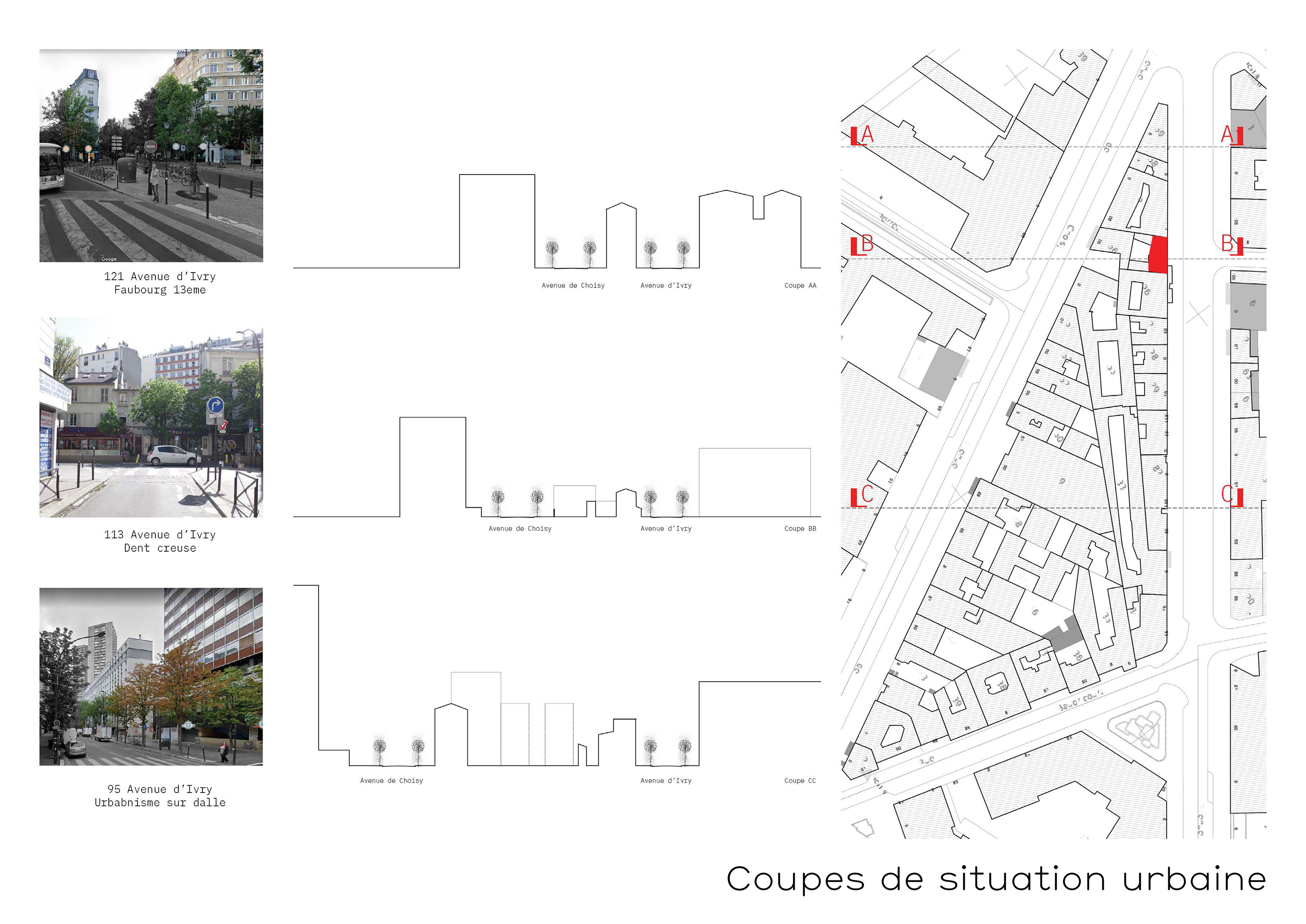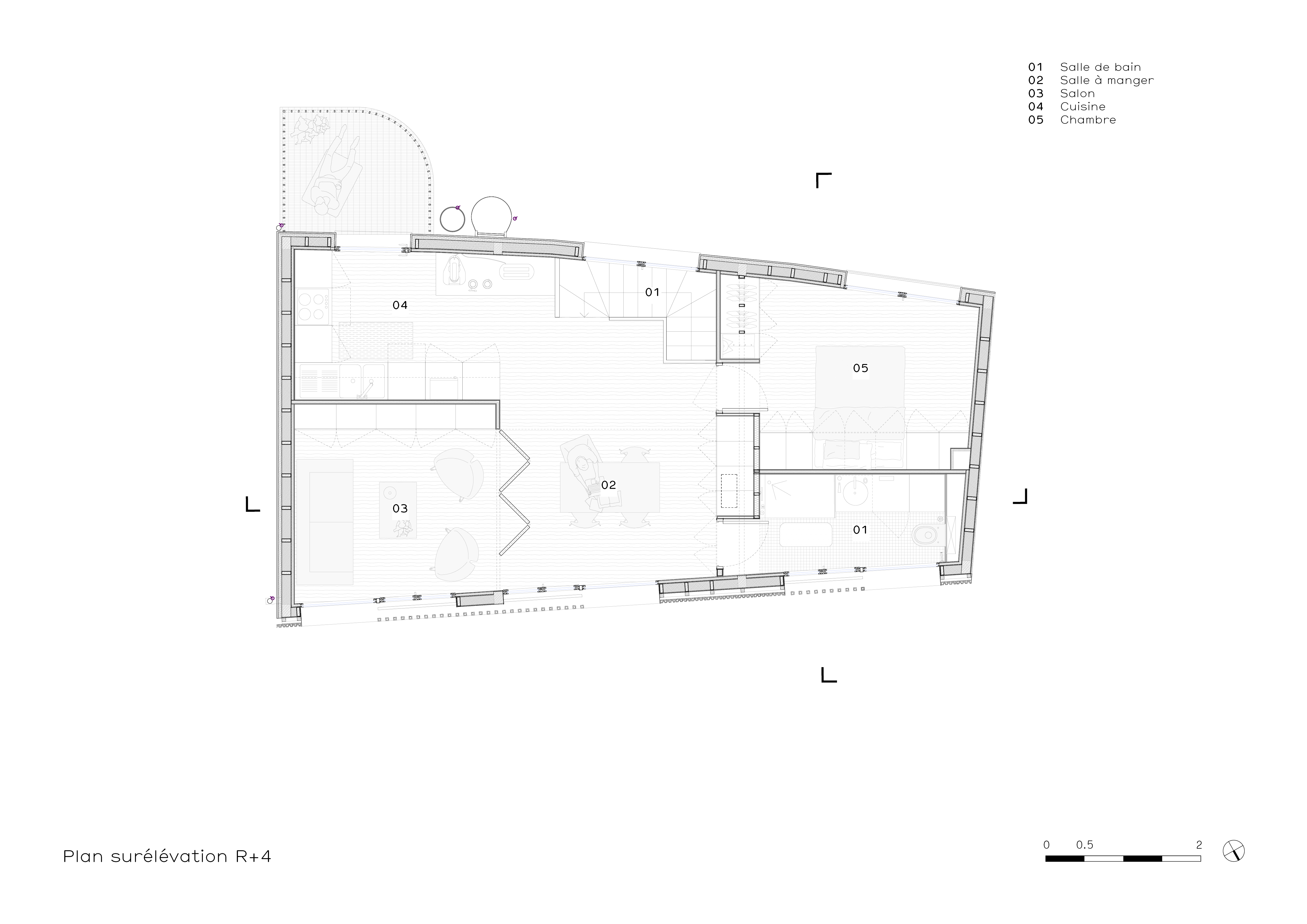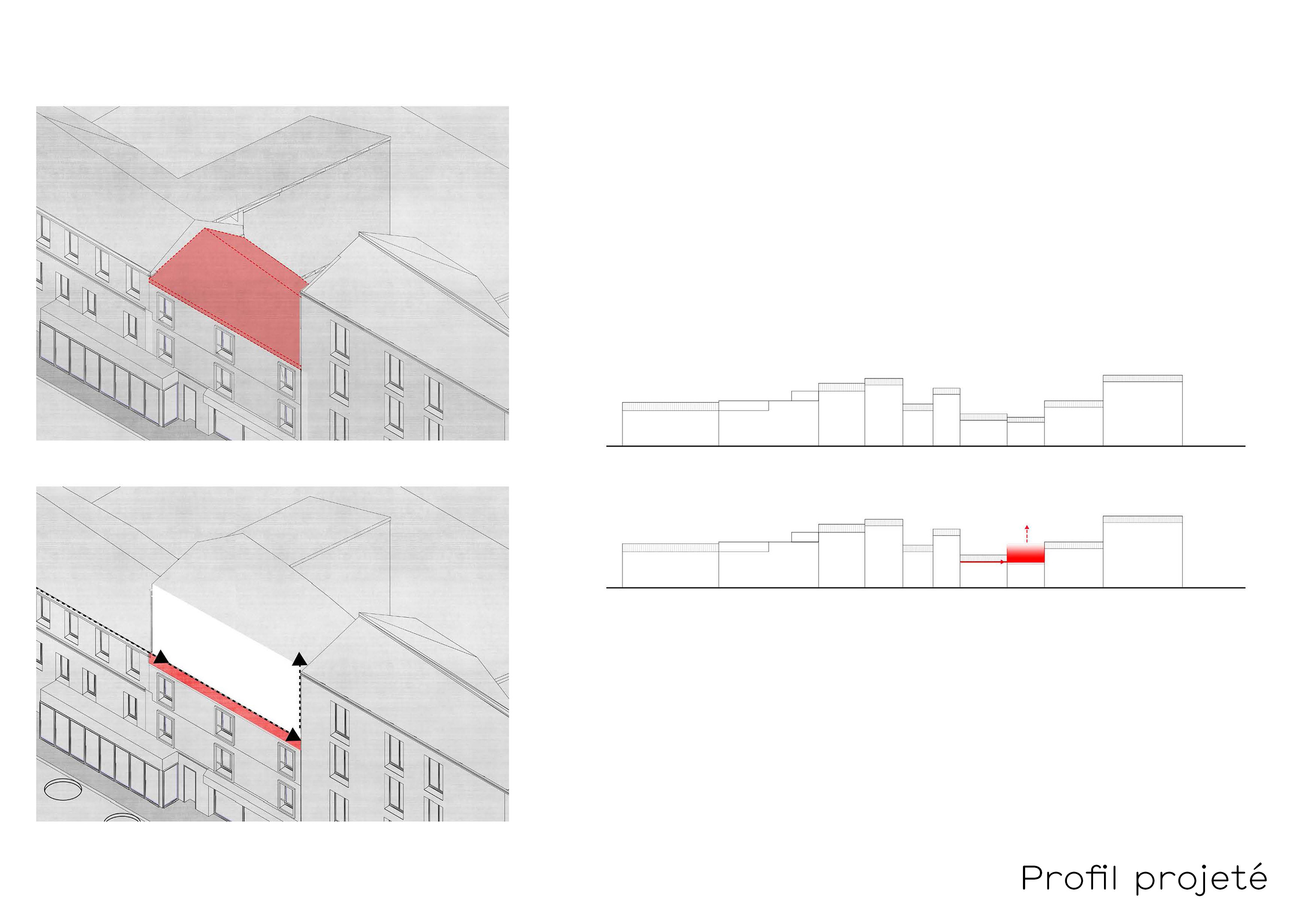 Dans un îlot triangulaire du 13e arrondissement, un petit immeuble faubourien du début du XXe siècle a été surélevé de deux étages pour créer 3 appartements supplémentaires. L’intervention préserve son caractère faubourien en alignant la façade surélevée au mitoyen et en conservant le rythme des baies avec trois travées traditionnelles de l'immeuble existant. De larges ouvertures apportent lumière et confort, tout en restant discrètes grâce à un jeu de cadrage maîtrisé par l’usage d'une double peau en céramique.
