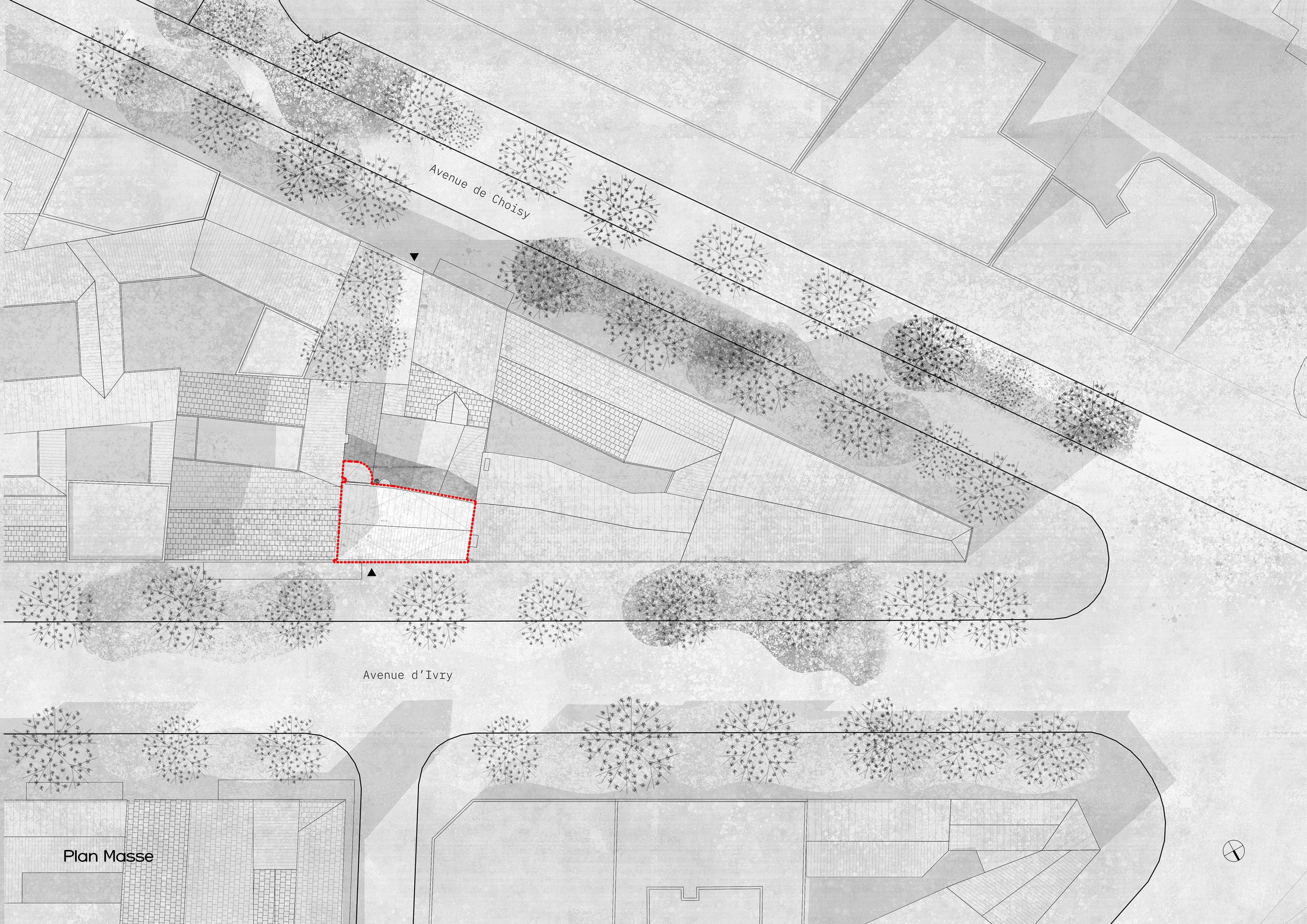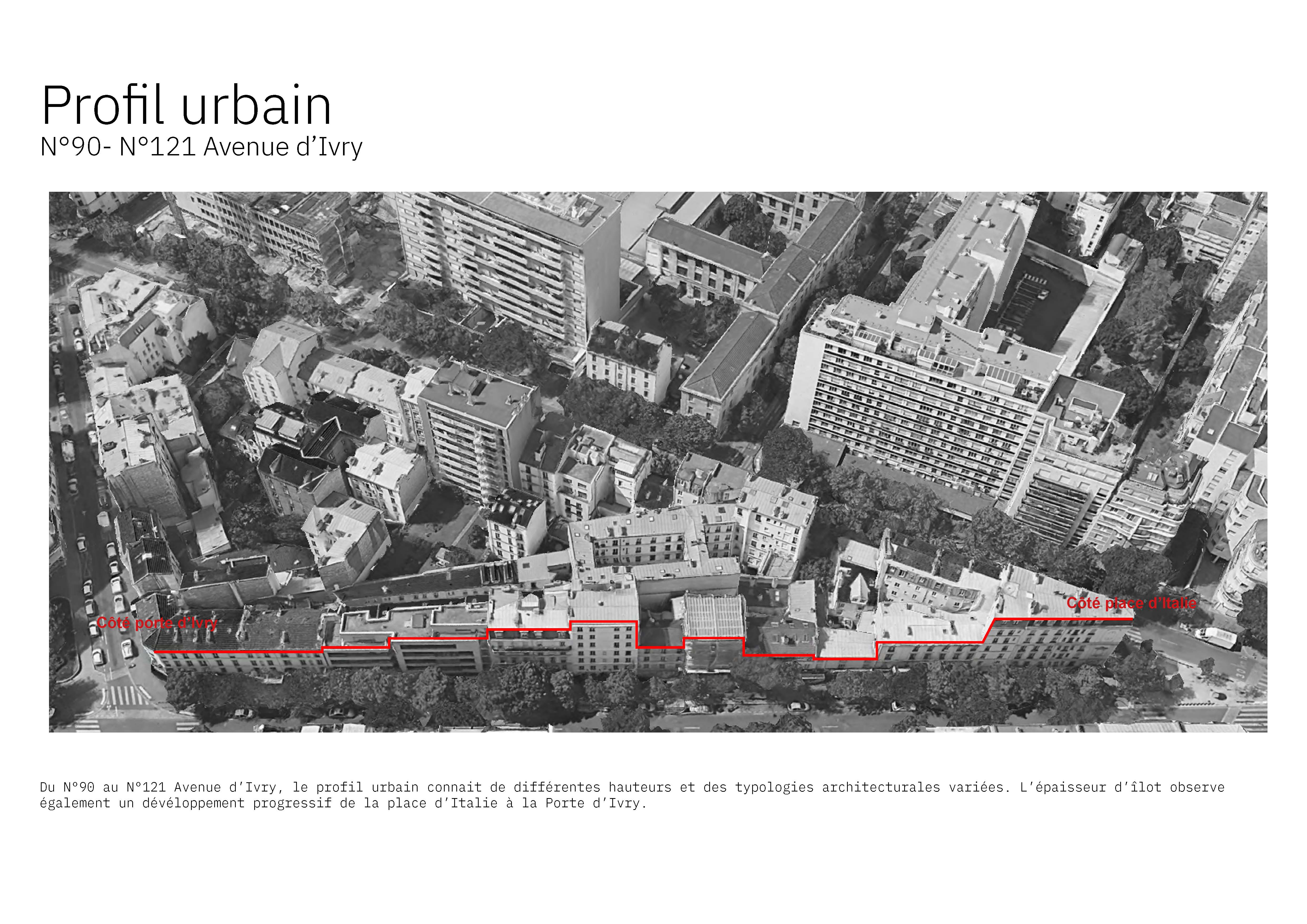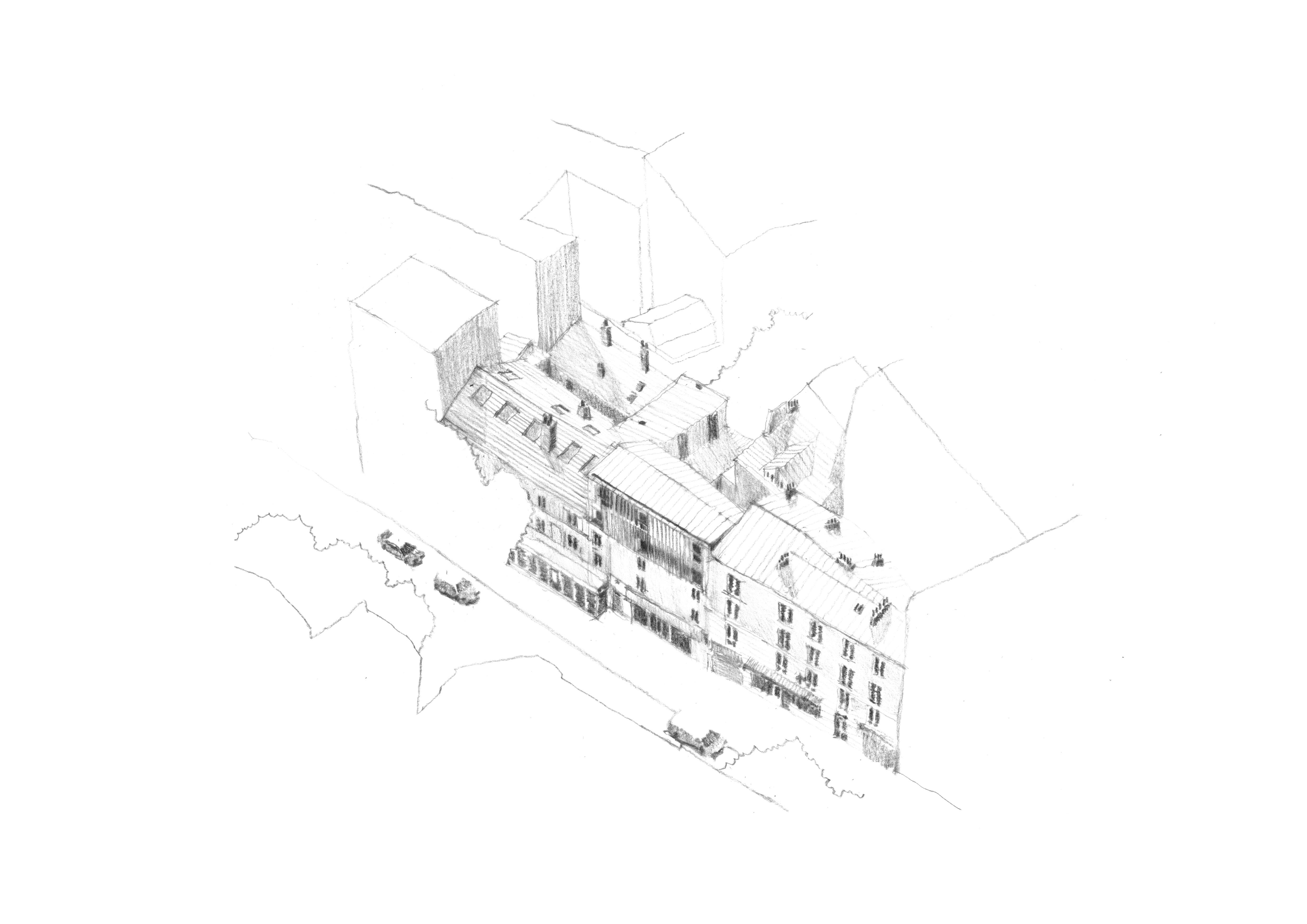 Dans un îlot triangulaire du 13e arrondissement, un petit immeuble faubourien du début du XXe siècle a été surélevé de deux étages pour créer 3 appartements supplémentaires. L’intervention préserve son caractère faubourien en alignant la façade surélevée au mitoyen et en conservant le rythme des baies avec trois travées traditionnelles de l'immeuble existant. De larges ouvertures apportent lumière et confort, tout en restant discrètes grâce à un jeu de cadrage maîtrisé par l’usage d'une double peau en céramique.