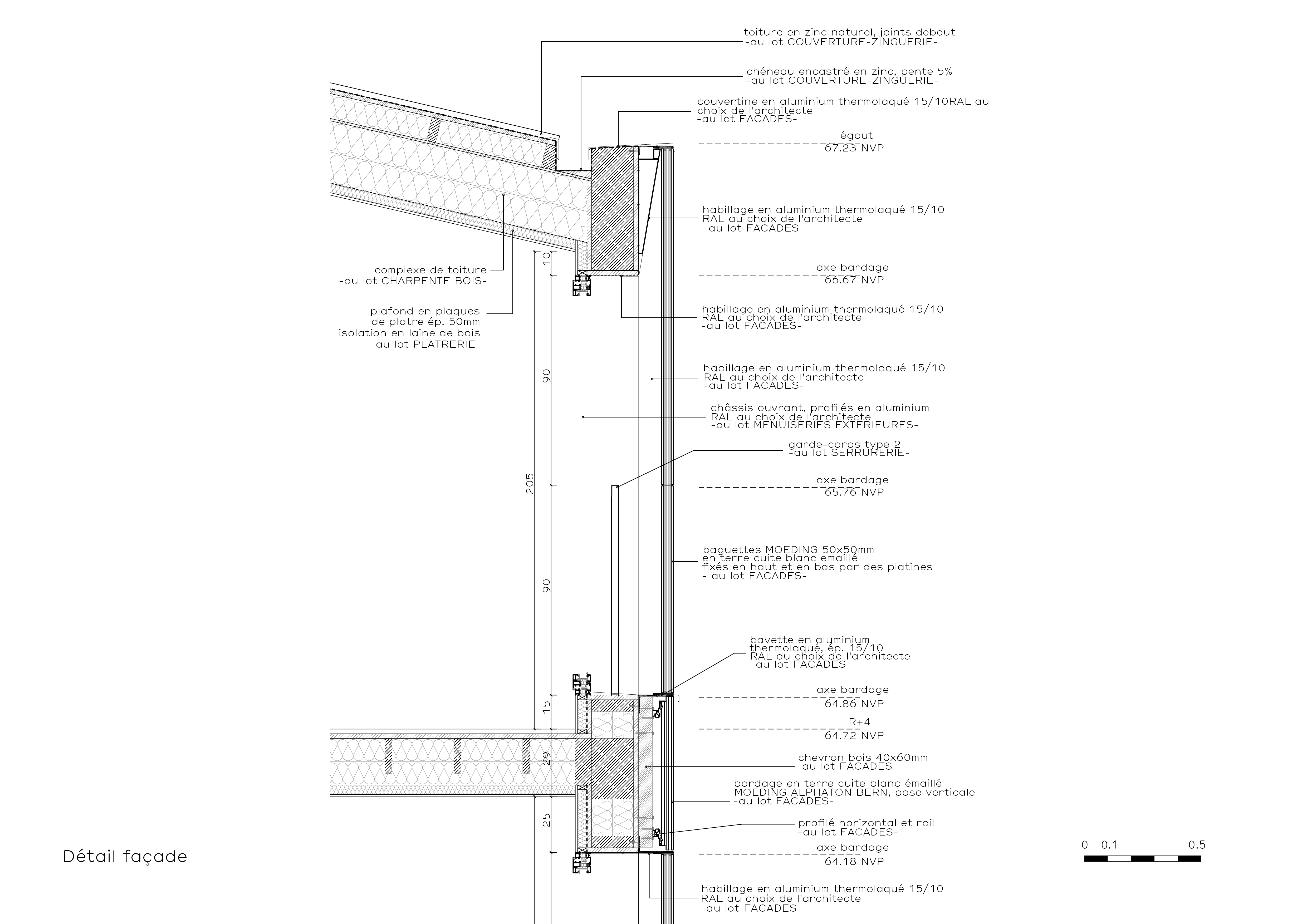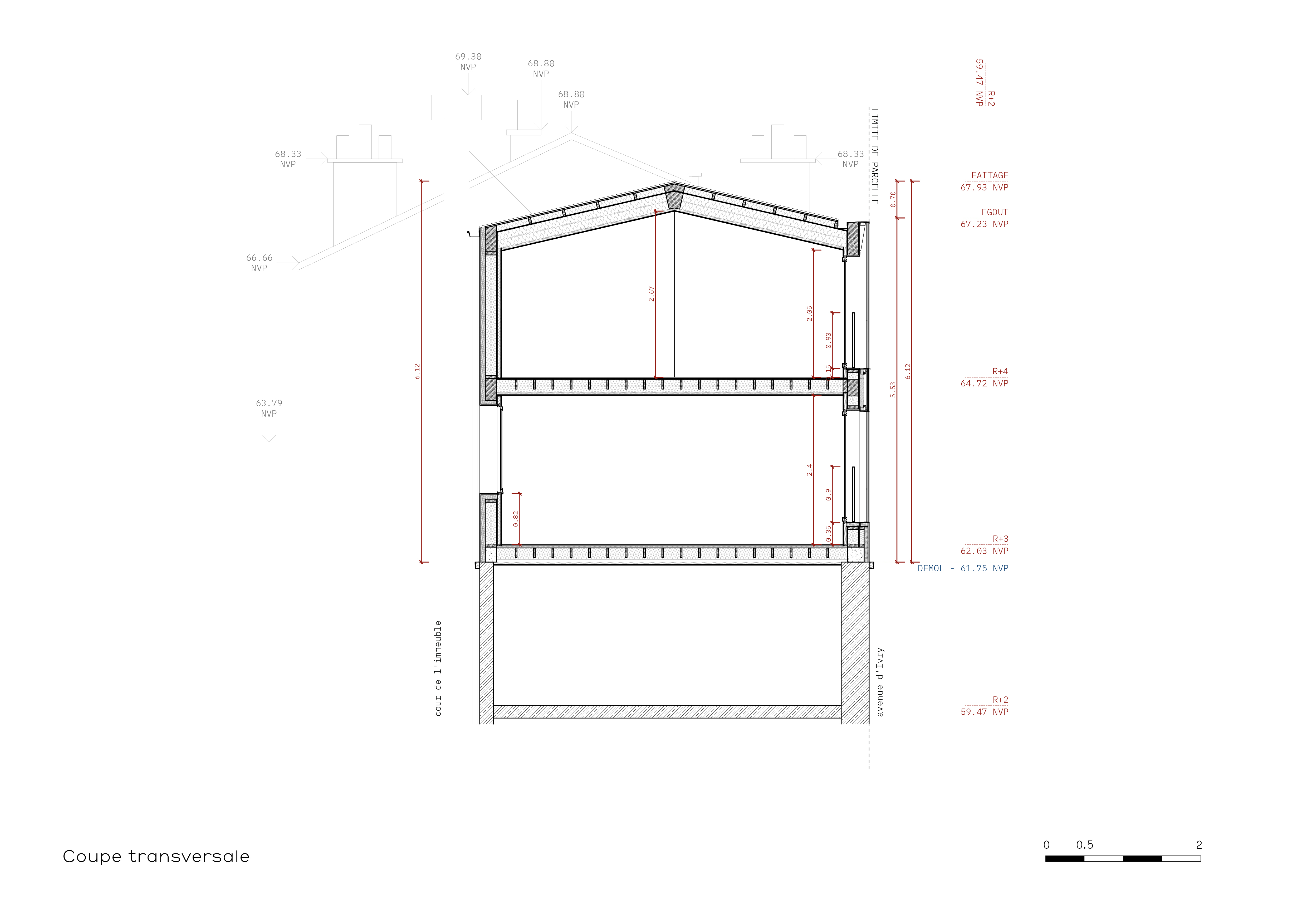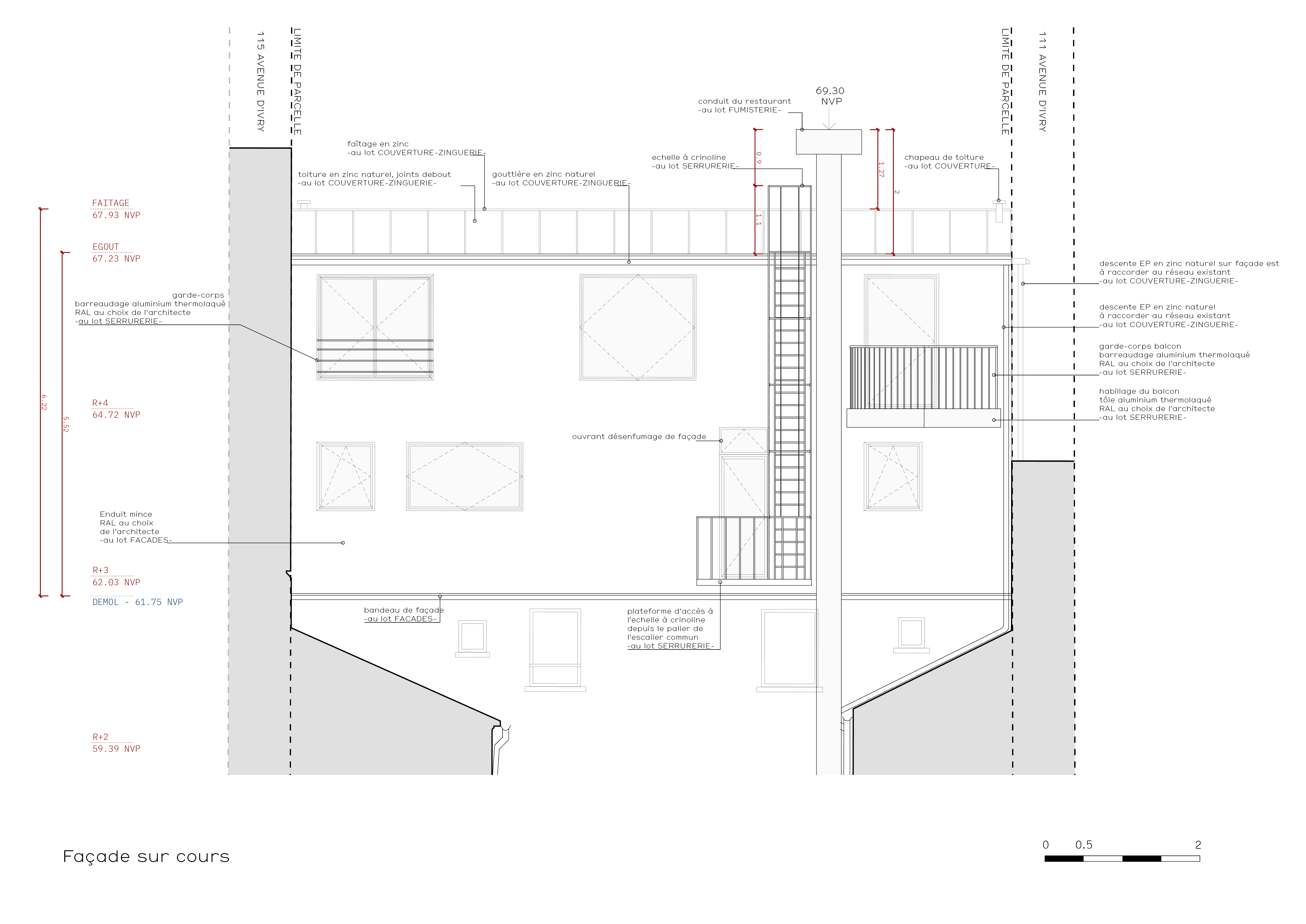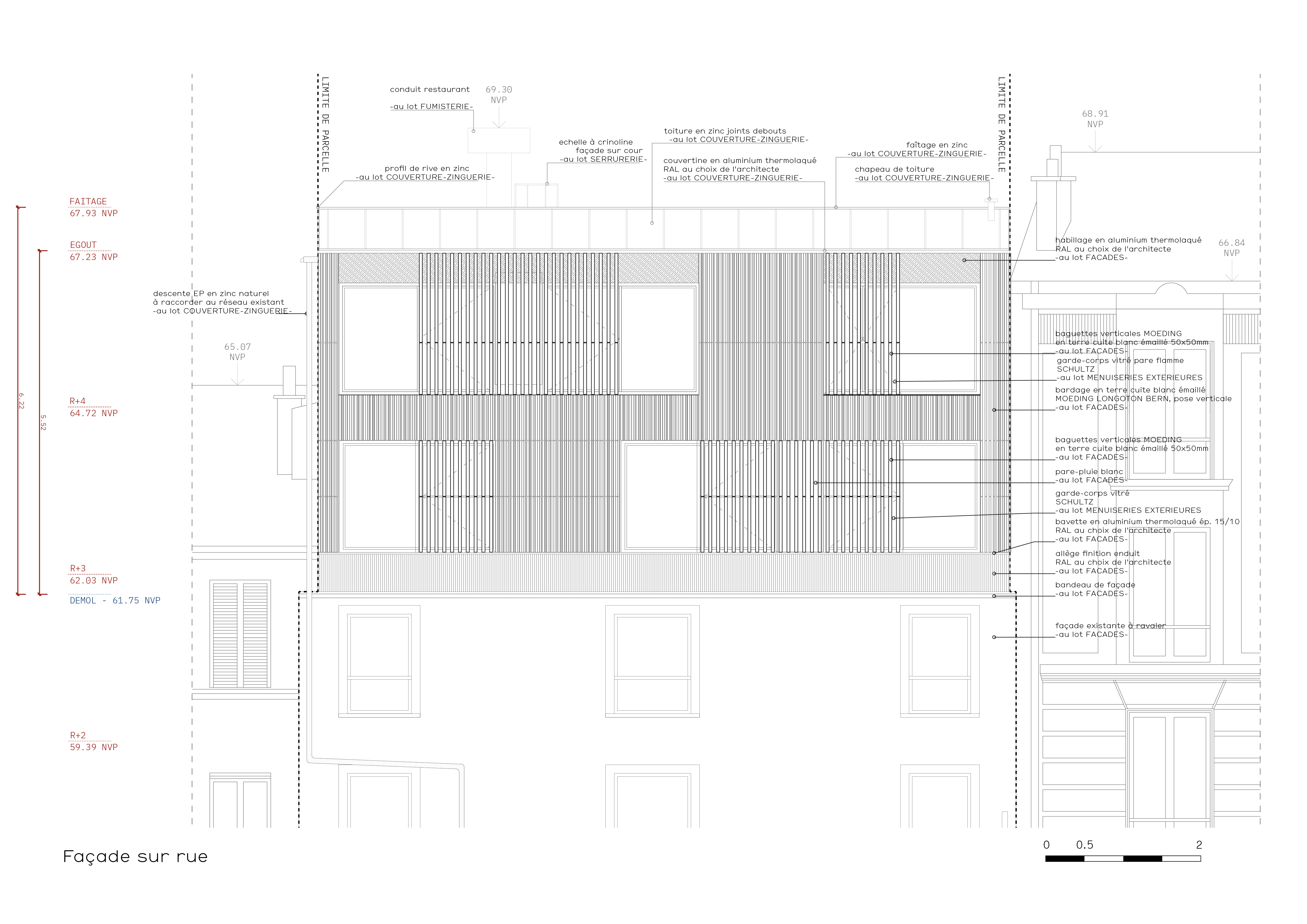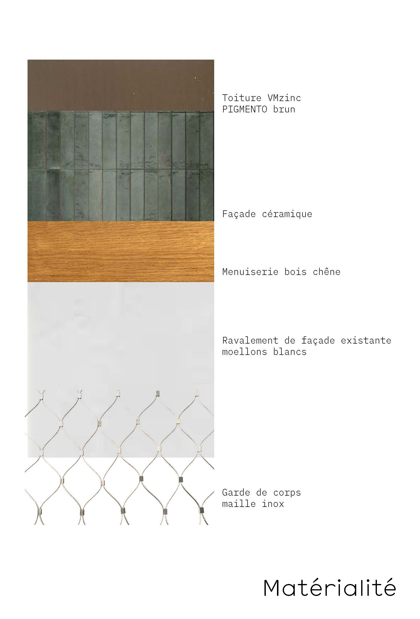 Approche environnementale : L’immeuble existant, de faible épaisseur, nous a permis d’intégrer 3 appartements traversants de petite taille, 23m², 27m² sur le 3eme niveau et 56m² sur le 4eme niveau, favorisant la ventilation naturelle. Orienté Nord-Sud, les grandes baies permettent une lumière naturelle généreuse. La double peau en céramique protège de la surchauffe en été. Elle génère une intimité aux appartements. Une isolation importante des murs et de la toiture minimise la consommation en chauffage l’hiver. Concernant l’aspect bas carbone, la surélévation est constituée d’une structure en bois.