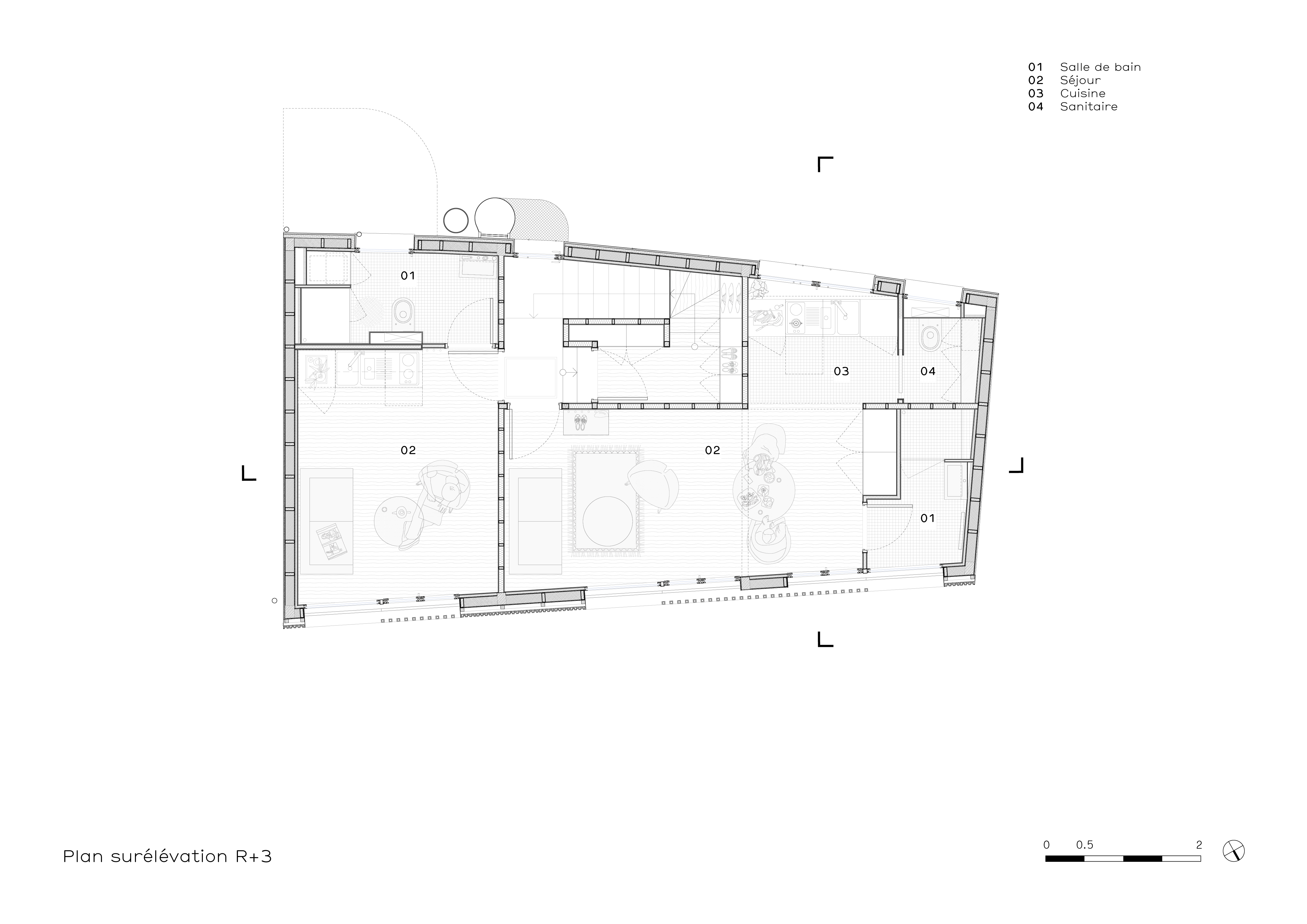 Descriptif technique : Structure : Il a fallu construire la surélévation en milieu occupé. Nous avons donc dans un premier temps retroussé la couverture au niveau de ses rives pour l’installation d’une assise béton. L’ossature a ensuite été posée avec la couverture en zinc encore présente de l’existant. C’est une fois la couverture du projet réalisée que le zinc existant a été déposé. La structure, fournie par suteki, est un système d’assemblage de poteaux poutres avec des connecteurs en acier. L’assemblage se fait à l’aide d’un simple maillet en suivant le plan. Une équipe de 3 personnes a été suffisante pour monter la surélévation en 10 jours et sans moyen de levage. Ce système fut idéal en site contraint.