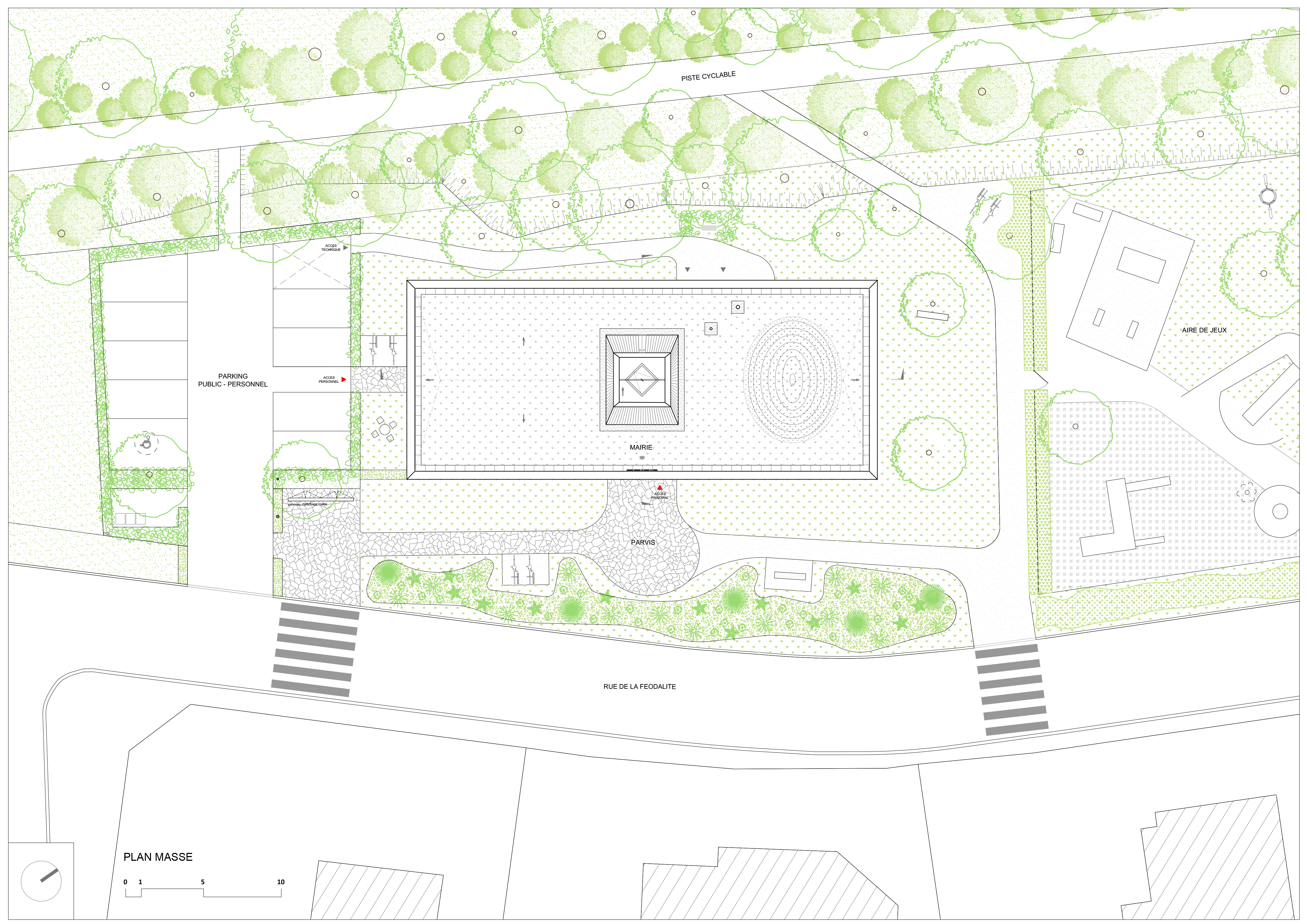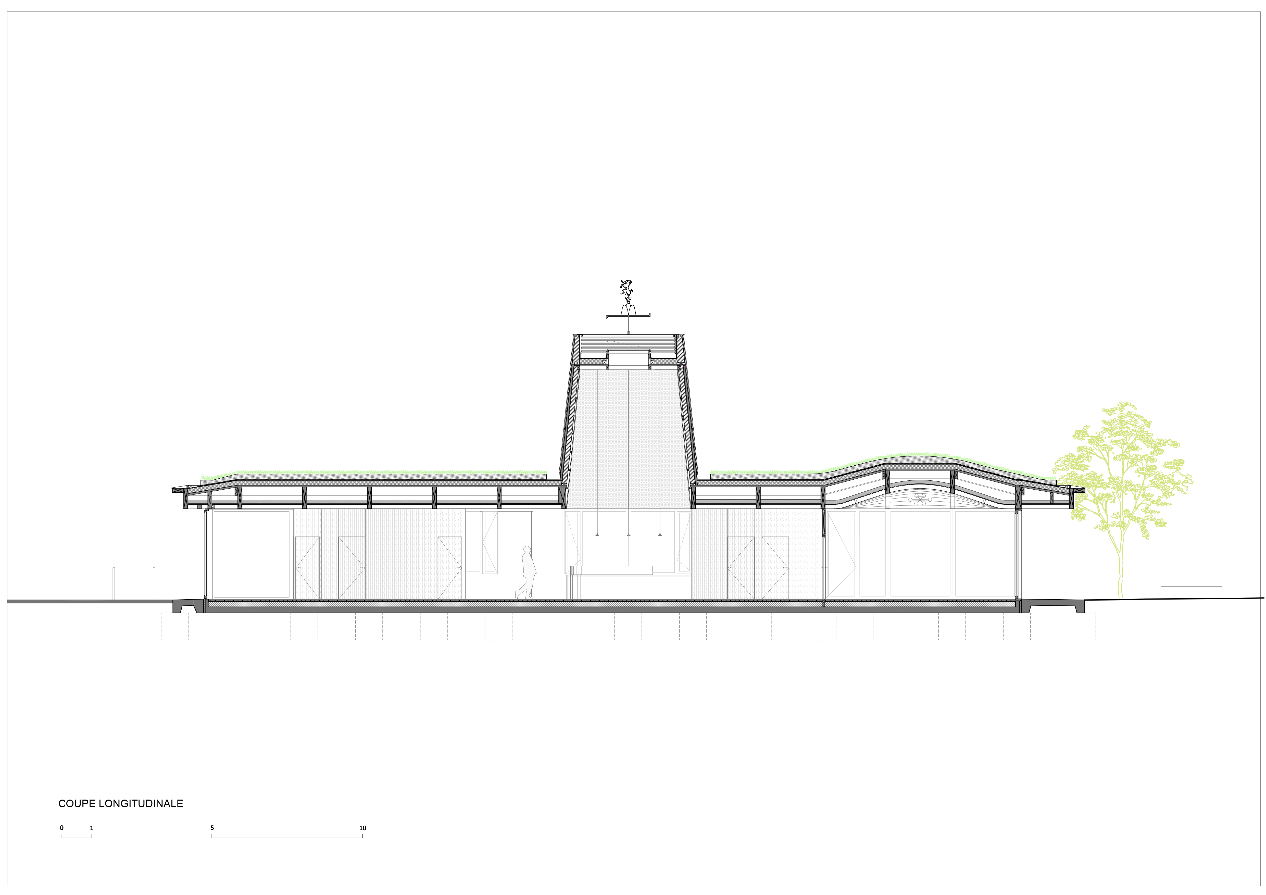 Descriptif technique : L’ensemble de l’ouvrage est en bois (charpente, MOB, men. ext. et int.). Les poutres maîtresses portent sur toute la largeur du bâtiment permettant une liberté d’aménagement et d’usages ultérieurs sans porteurs intermédiaires. La charpente à la française en bois massif local est laissée apparente dans l’ensemble du bâtiment. Au niveau de la salle du conseil et des mariages elle se déforme élégamment pour former une voûte en bois donnant de l’ampleur et de la solennité à cet espace symbolique fort. Les solives courbes sont en bois massif découpé, reprenant ainsi un savoir-faire ancestral, sans recourir au collage, cintrage ou autre technique complexe. La numérisation permet une variété de profils créant une voûte à inertie variable dans les 2 directions.