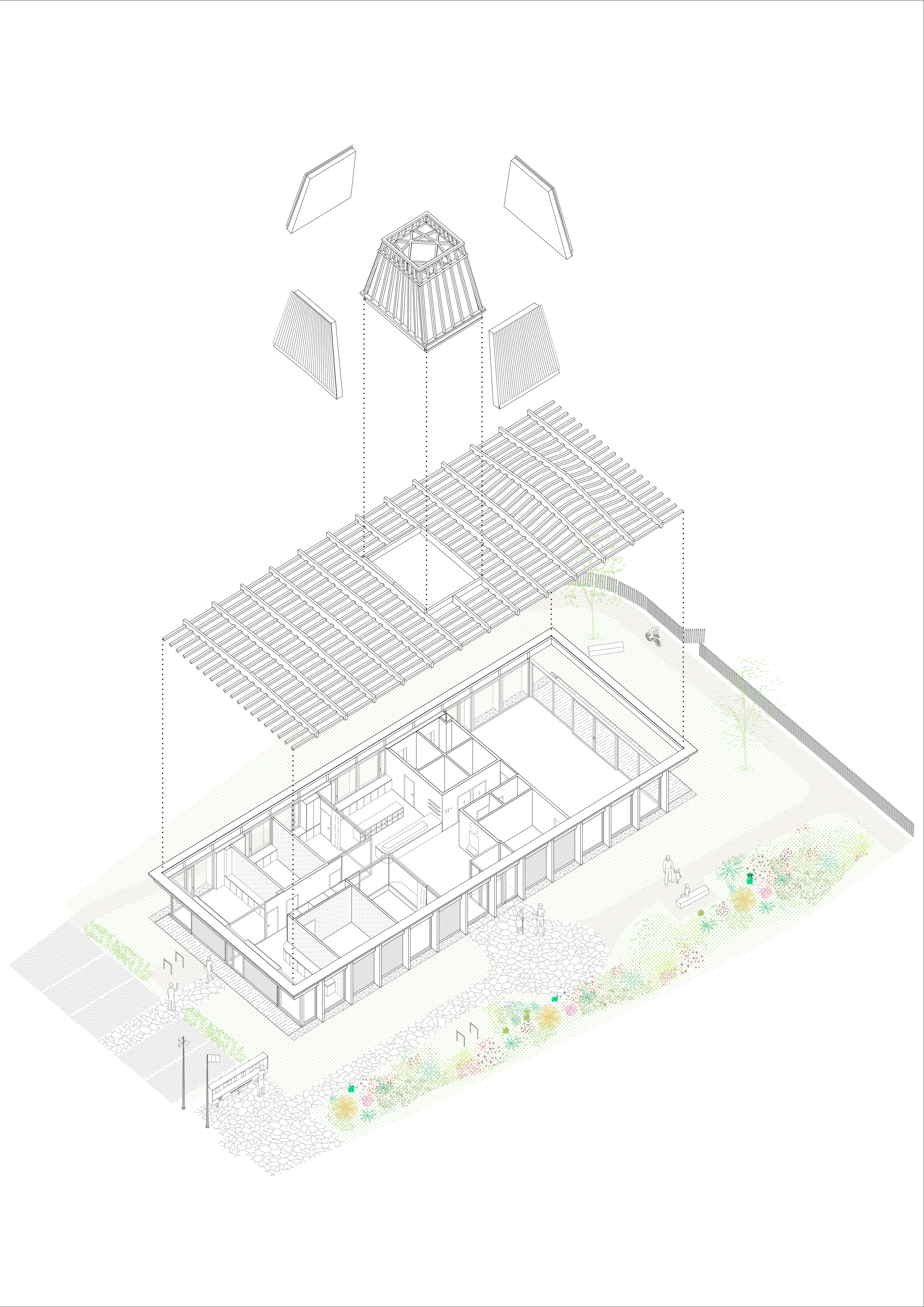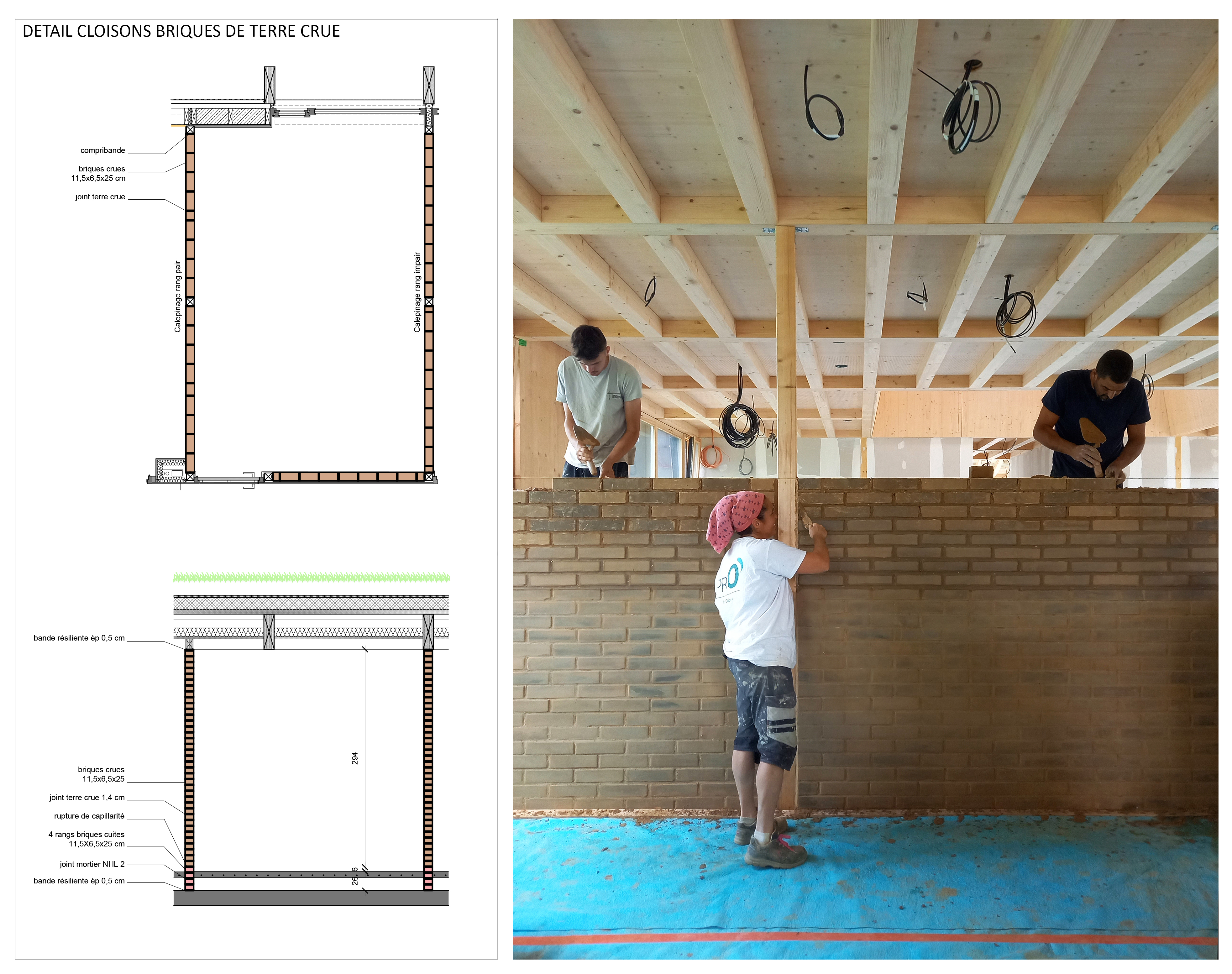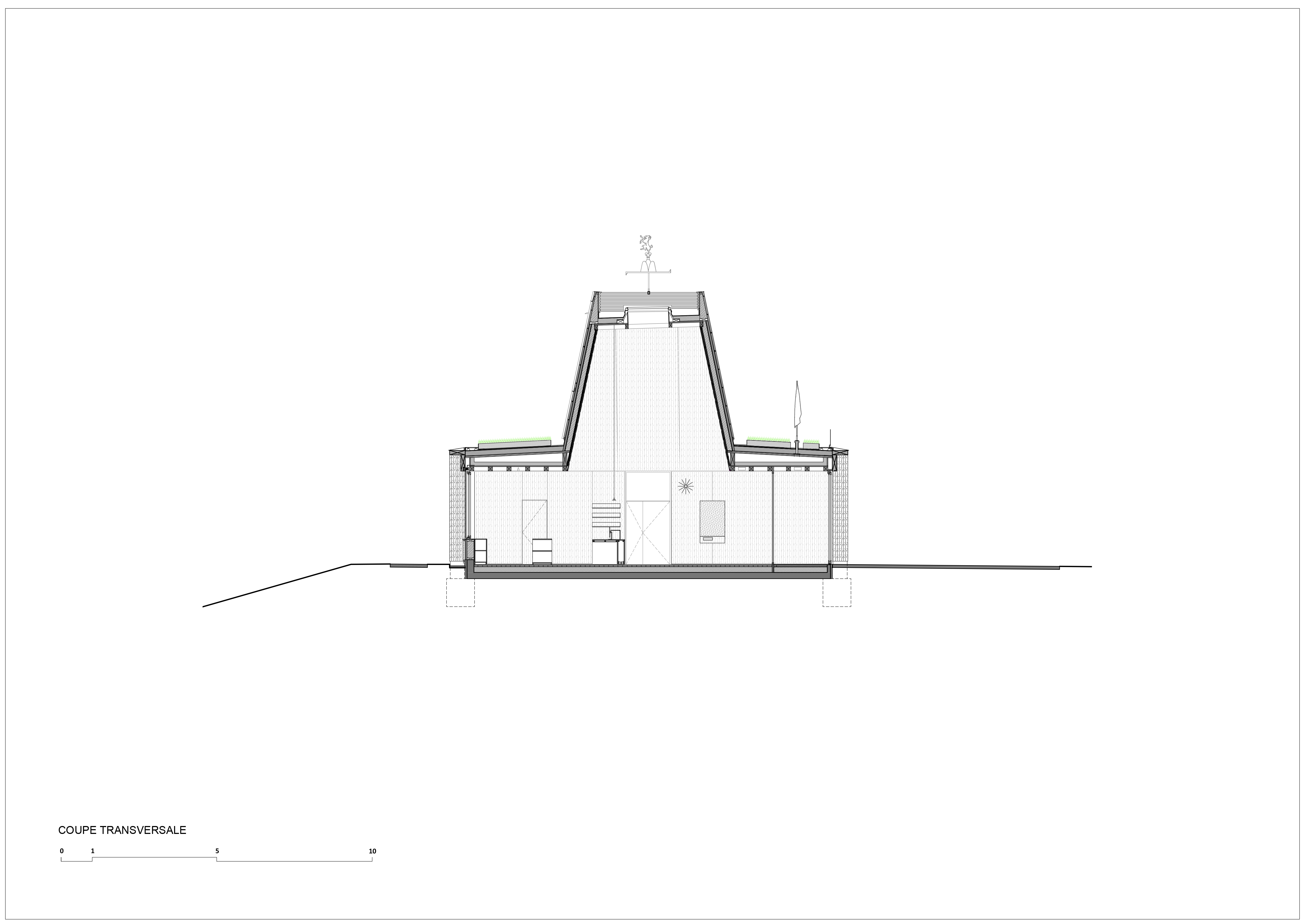 Approche environnementale : Au centre de la toiture végétalisée, une émergence offre un volume intérieur généreux au hall d’accueil, et agit comme un signal à l’échelle du village notamment avec sa girouette reprenant les blasons de la commune. Elle permet également une surventilation naturelle du bâtiment participant activement au confort d’été. Les isolants sont biosourcés et apportent un fort déphasage thermique, couplé à l’inertie de la dalle béton, pour un bâtiment confortable en toute saison, de niveau passif. Les cloisons sont en briques de terre crue, laissées apparentes ou recouvertes d’un enduit terre blanc.