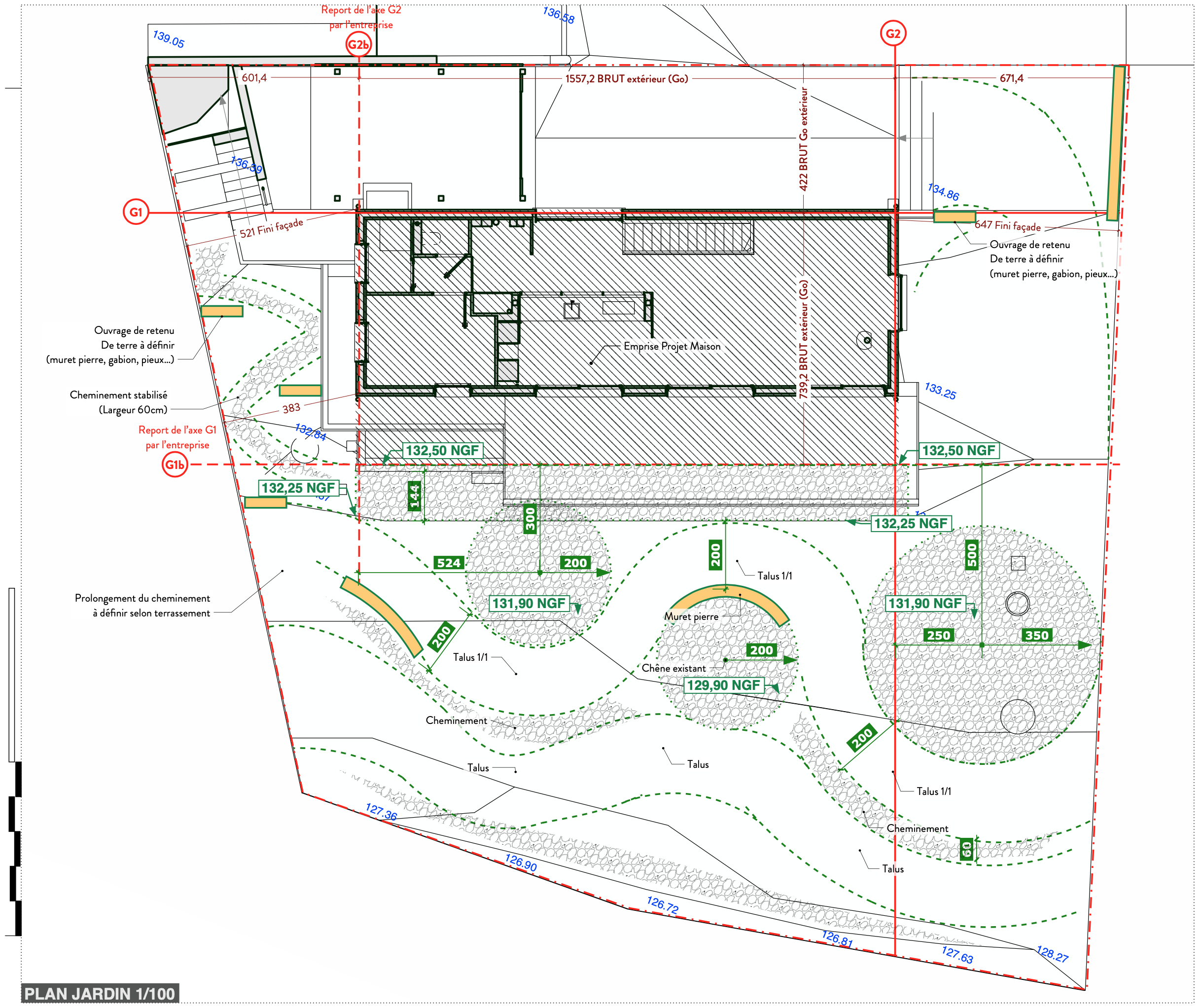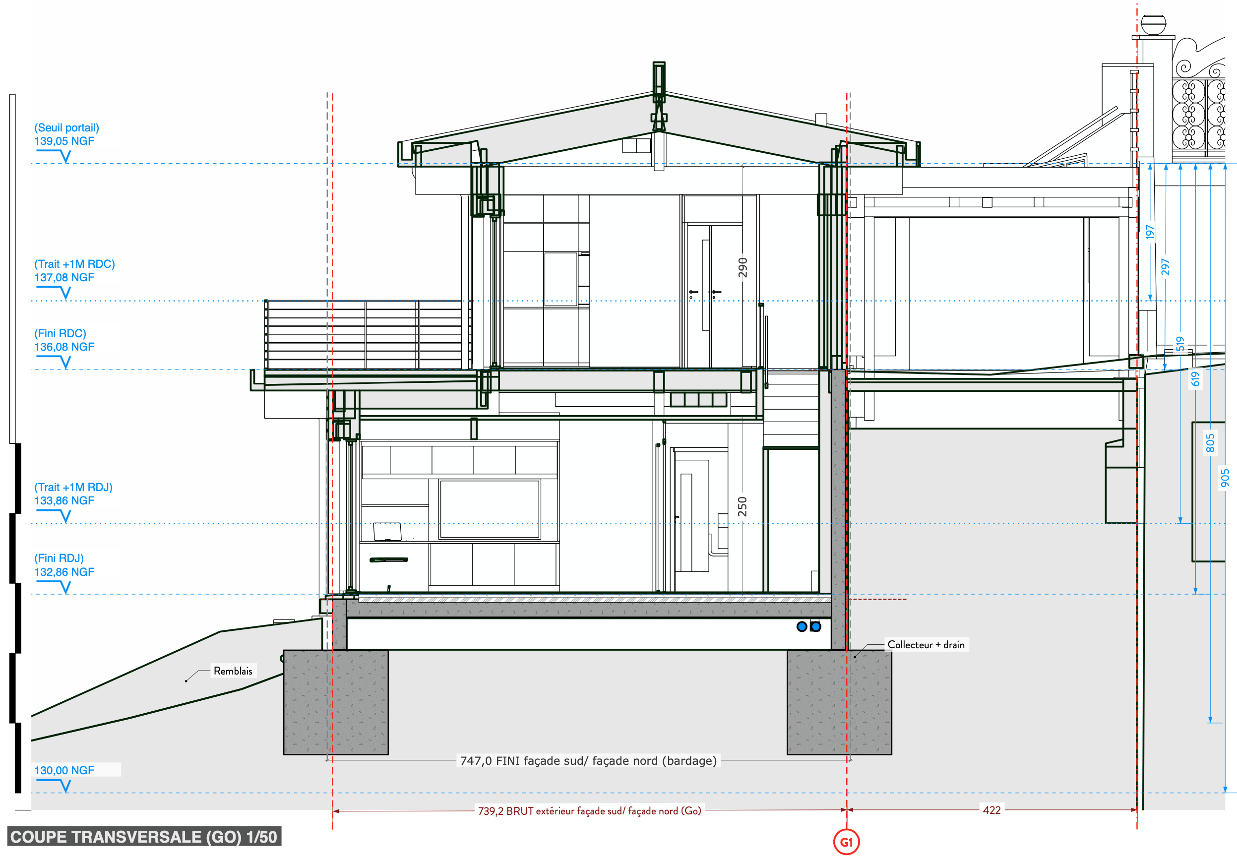 Descriptif technique : Fondation sur puits, plancher bas murs de soutènements en béton armé. Système constructif en ossature bois 140mm avec renforts poteaux-poutres LC en épicéa. Revêtements des façades en bardage Douglas lasuré, dessous de toiture en panneaux épicéa. Revêtements des sols intérieurs et agencements en Chêne. Aménagements des clôtures et structures du carport en Douglas. Couvertures et capotages en zinc naturel.
