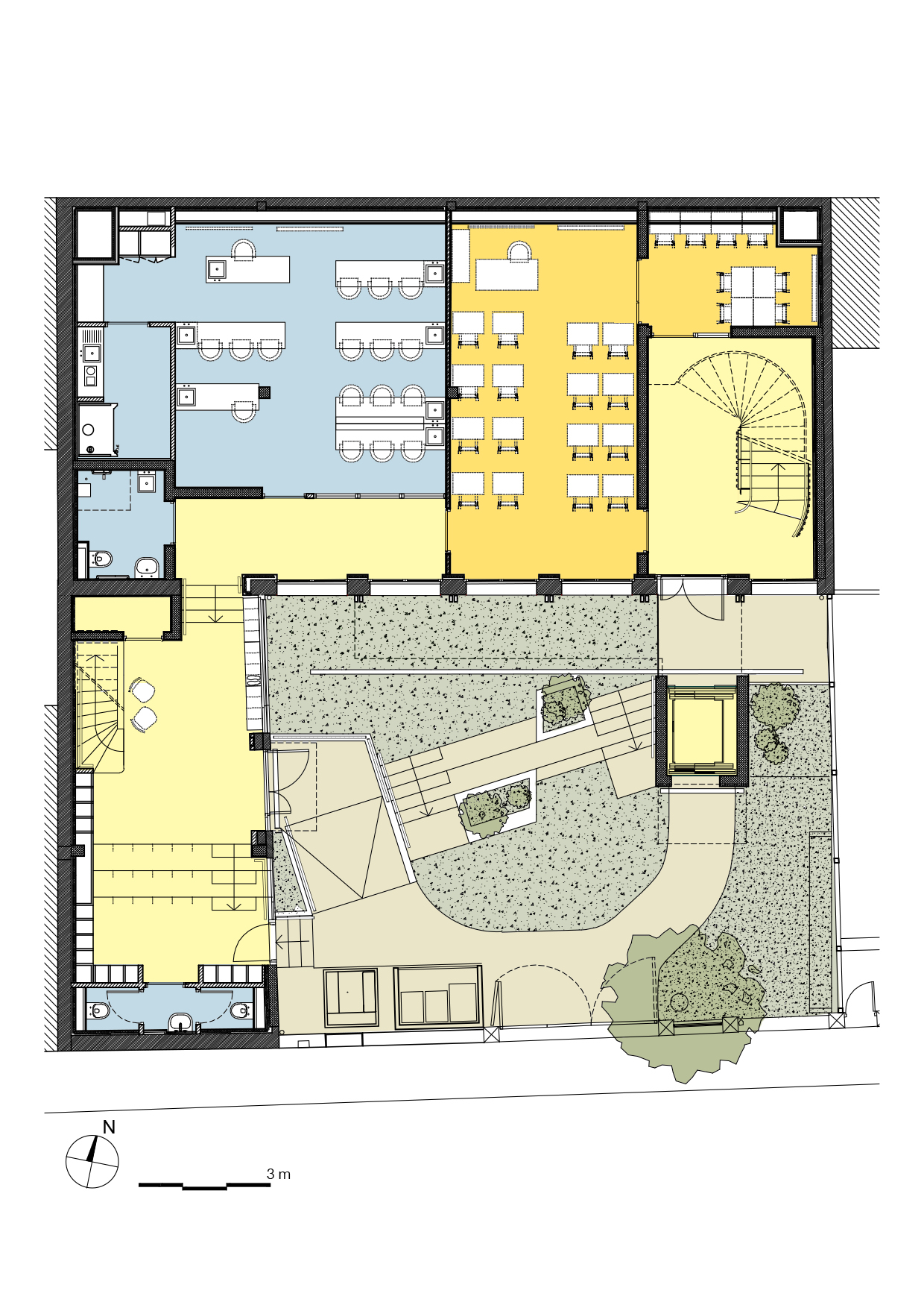 Descriptif technique : La structure du bâtiment existant étant en poteaux poutres bois, la part du bois dans la restructuration a été un point essentiel. Les isolants et les faux plafonds sont en fibres de bois et le plafond de la grande salle polyvalente est en bois red cedar comme le bardage extérieur. Un travail de captation de lumière en cas d’évacuation et en cas de coupure d’électricité est mis en place par des éléments photoluminescents sur toutes les premières et dernières marches à l’intérieur et à l’extérieur. Des marches photoluminescentes sur cour sont créées pour éviter d’avoir la nécessité de l’éclairage en cas de coupure totale ou en dehors des horaires scolaires. Le béton photoluminescent est fabriqué avec les démolitions des murets.
