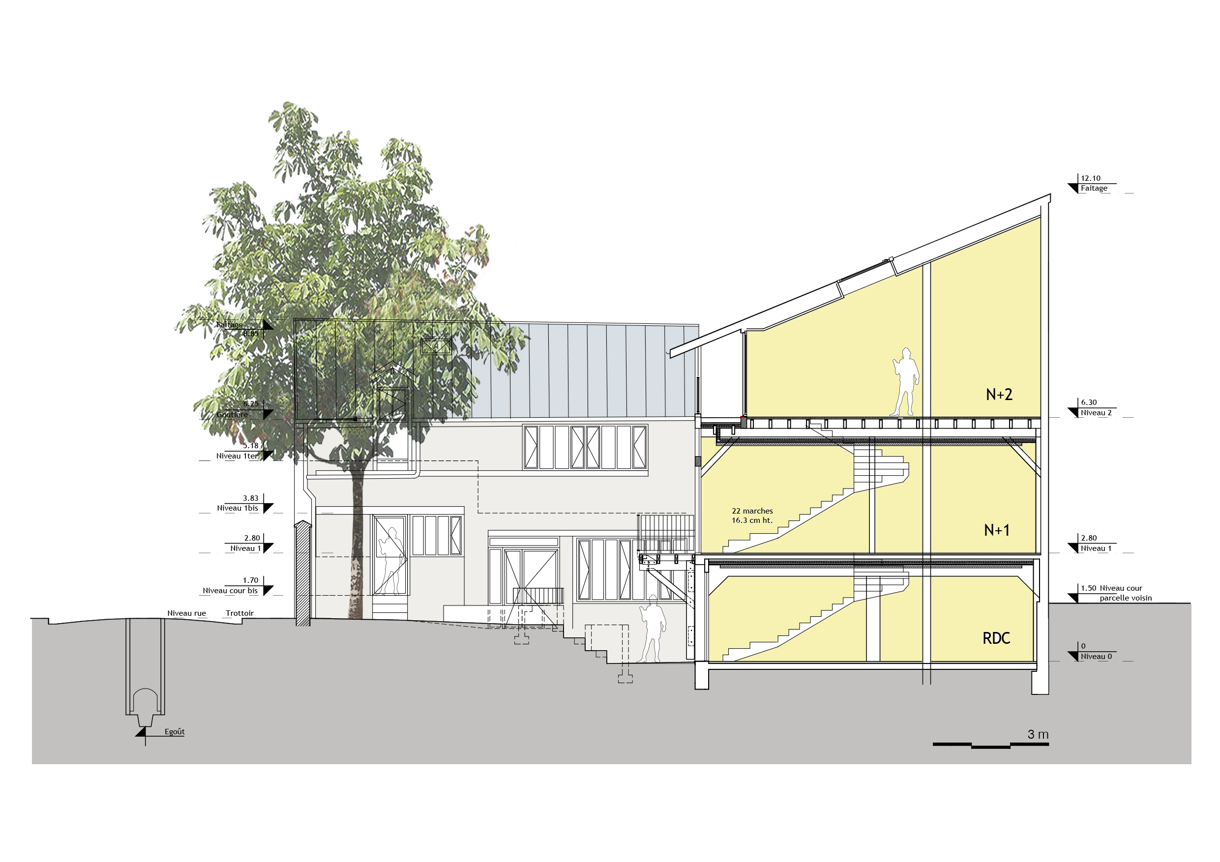 Approche environnementale : Notre intervention vise à valoriser le passé arboricole de la parcelle afin de conserver l’essence de l’ouvrage et rendre accessible l’ensemble des niveaux. La façade largement vitrée au sud permettra de capter les apports solaires et les grands balcons et loggias en bois permettront de protéger les espaces pour apporter un confort d’été. L’accessibilité est au cœur de l’intervention car une multitude de dénivelés est présente. Les circulations verticales sont créées afin d’agrandir les largeurs de circulation et s’harmoniser avec les larges balcons-terrasses en bois.