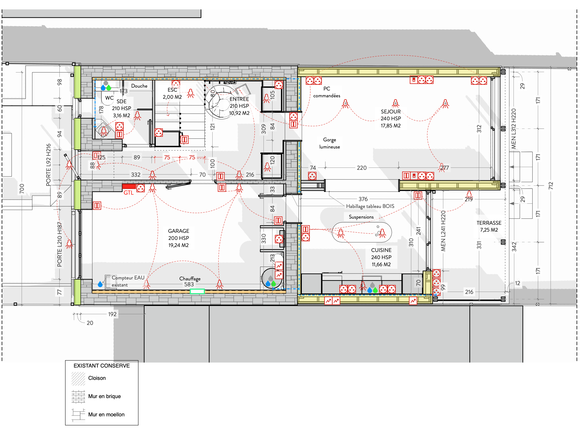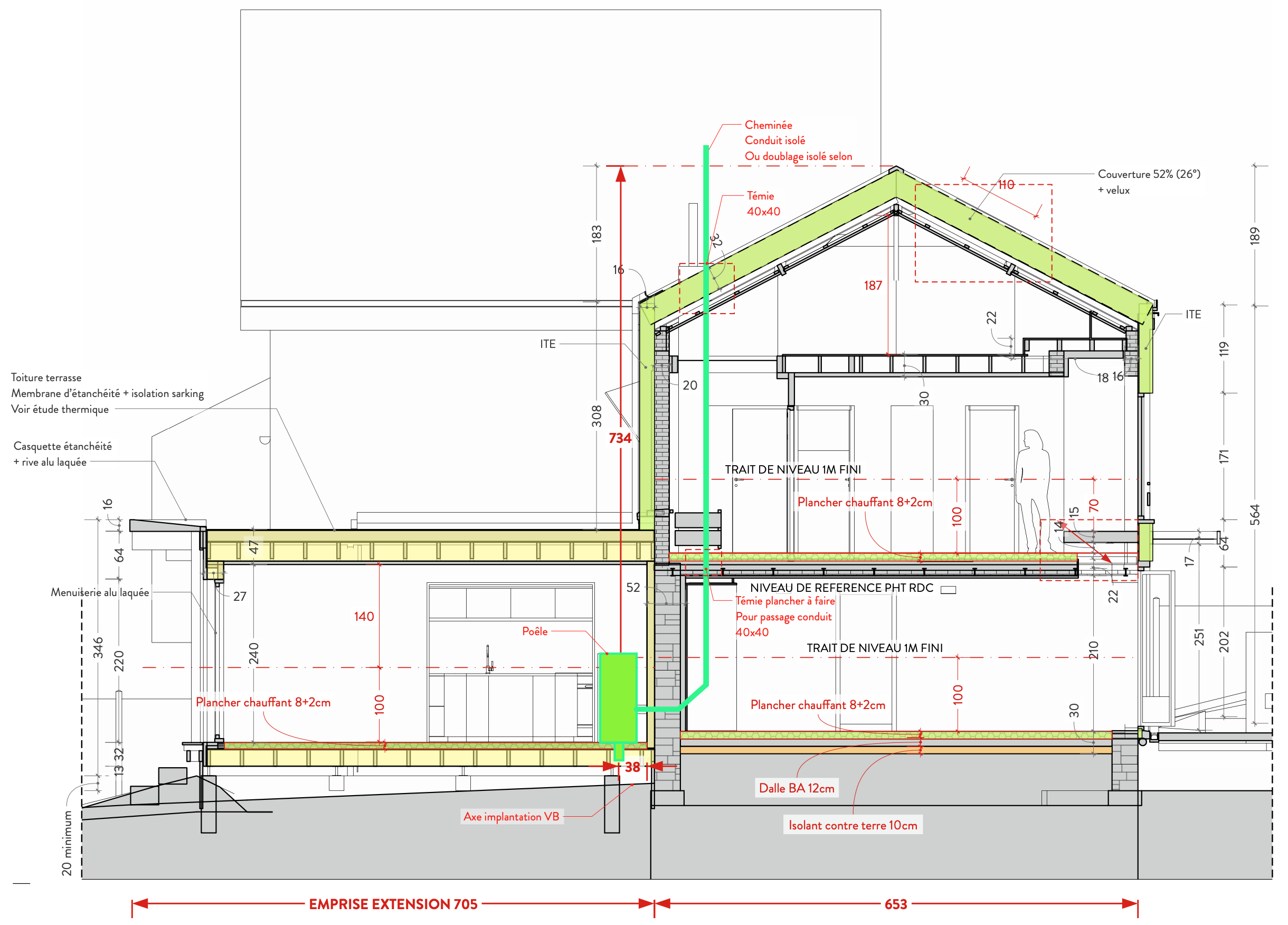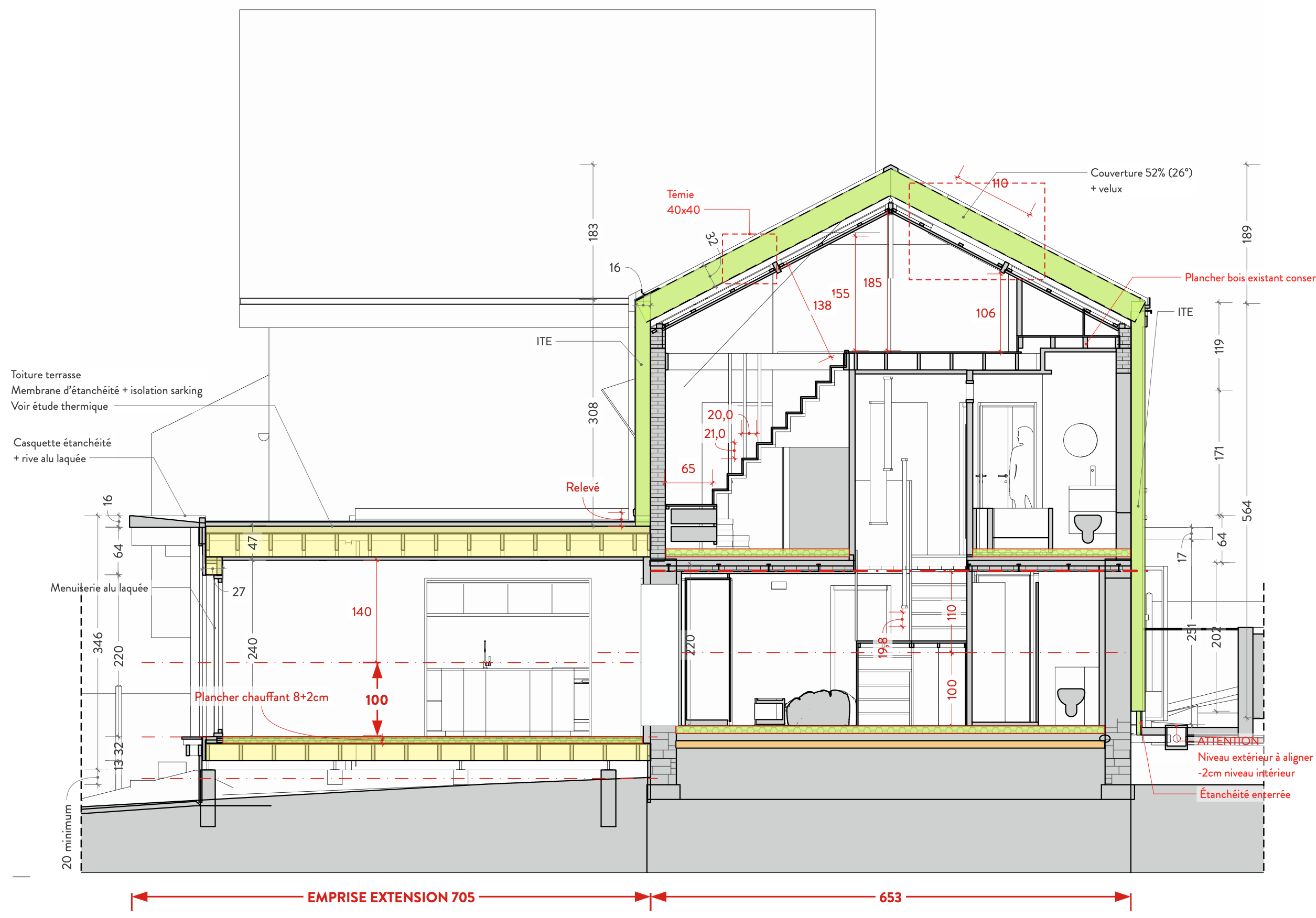 Faire d’une petite construction des années 30 une maison de ville agréable et bien isolée. La maisonnette était habitable sur un seul niveau surélevé (49m2). Le projet créé un escalier intérieur pour relier le niveau cave-garage à l’étage, puis une extension en bois coté jardin (30m2) pour un nouveau séjour-cuisine et enfin un aménagement dans les combles pour deux chambres-duplex.
