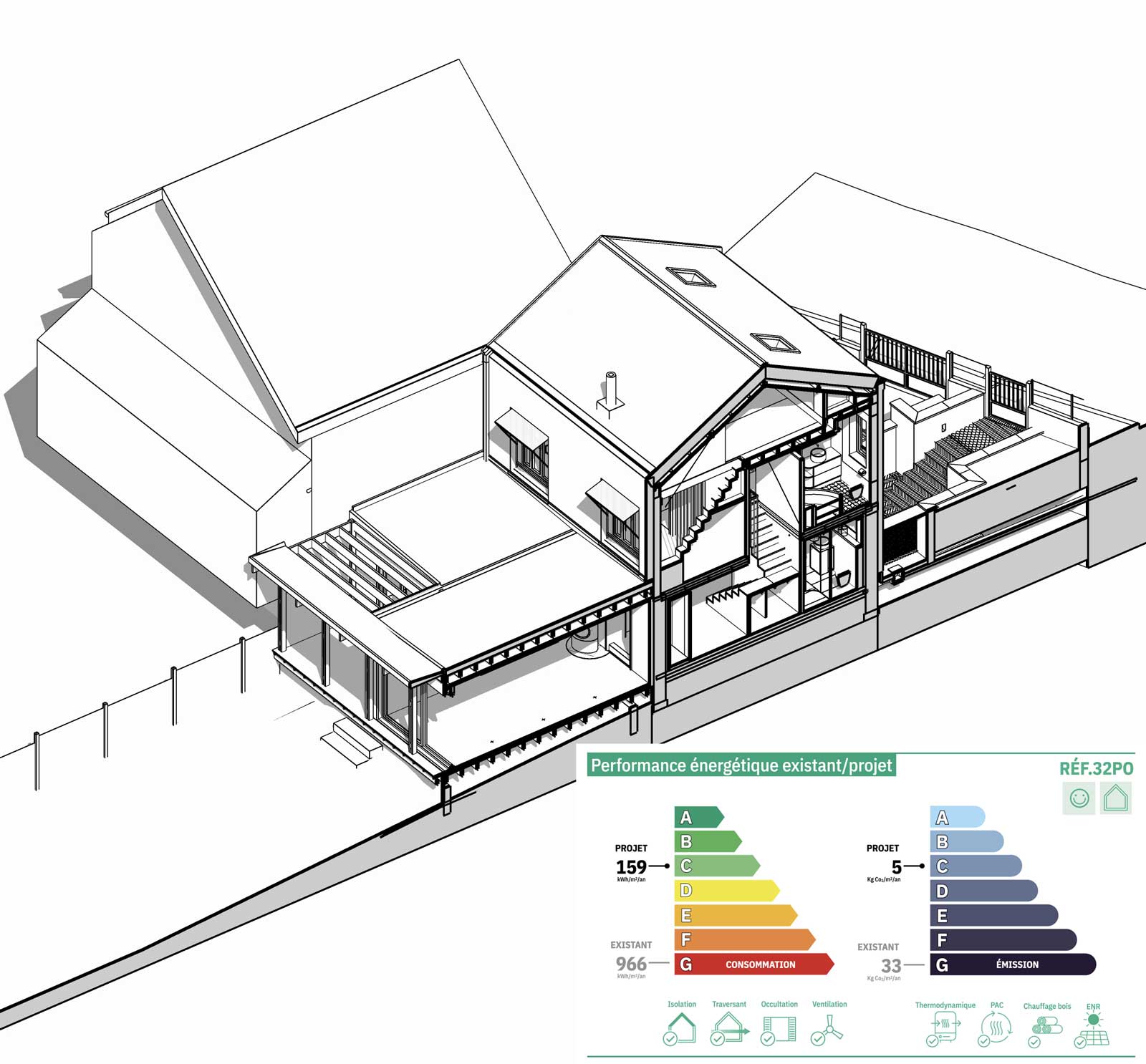 Approche environnementale : Rénovation biosourcée avec passage d'une étiquette énergétique G à B avec ITE+sarking en fibre de bois, tuiles peintes en blanc, débordant de toiture, PAC AIR/EAU + ECS thermodynamique