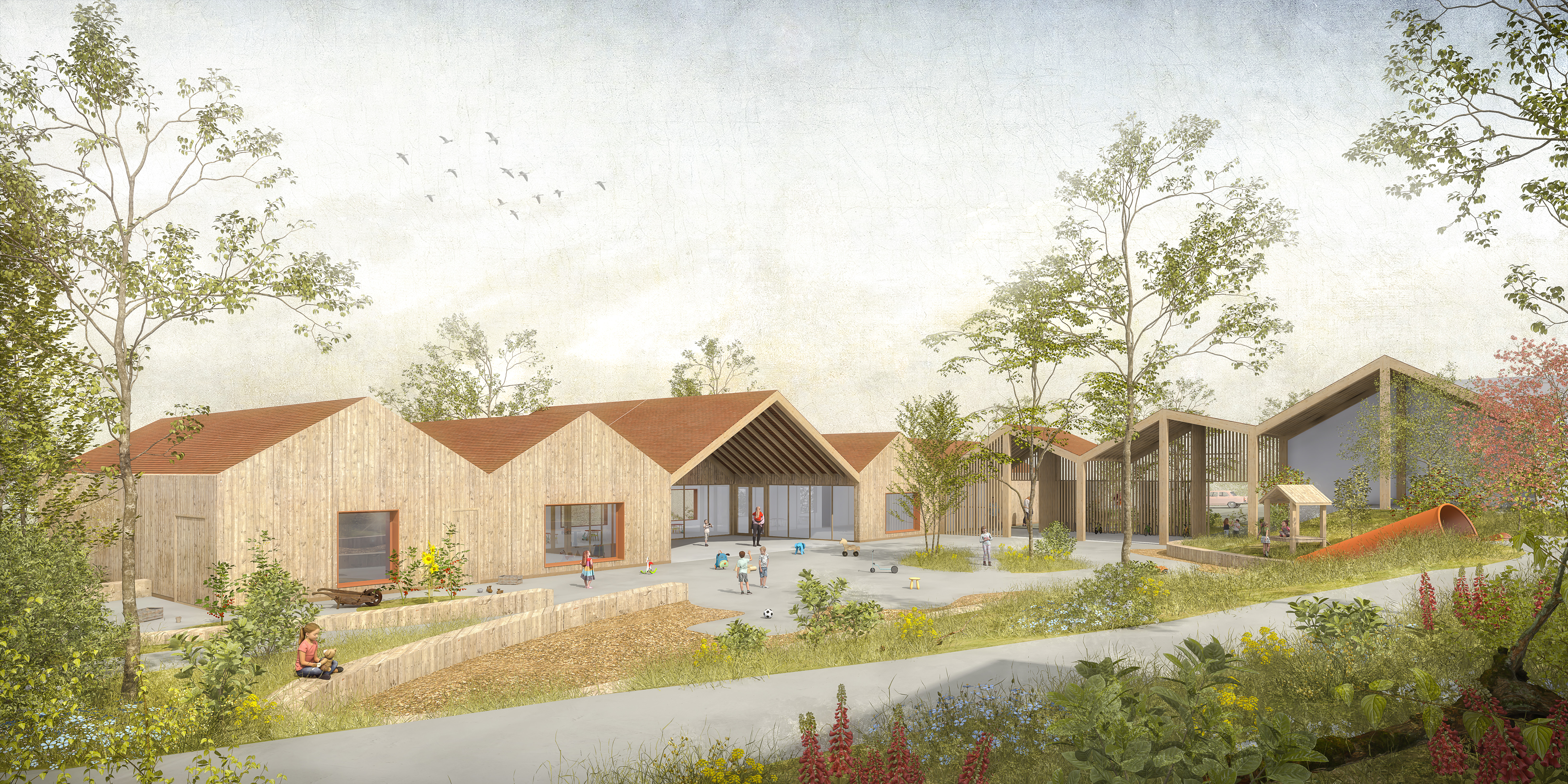 L’accueil périscolaire s’implante en cœur de bourg, en second plan de la voie principale. Il privilégie d’une vue en surplomb sur le vallon. La cour est mutualisée avec celle de l'école, il y a donc une cour haute existante assez minérale et une cour basse perméable et très végétale. Le bâtiment reprend les typologies voisines en double pente sous une architecture plus contemporaine.