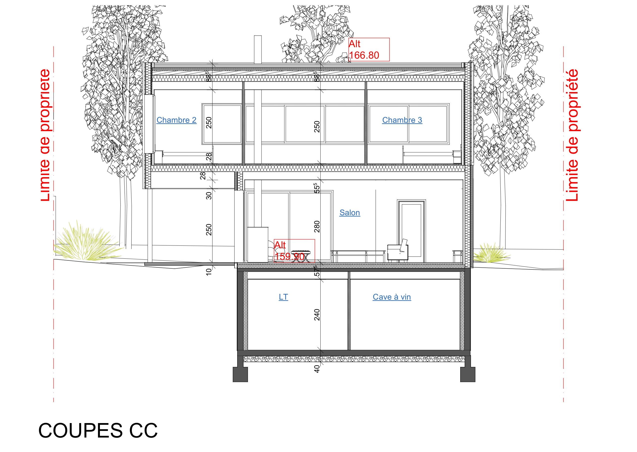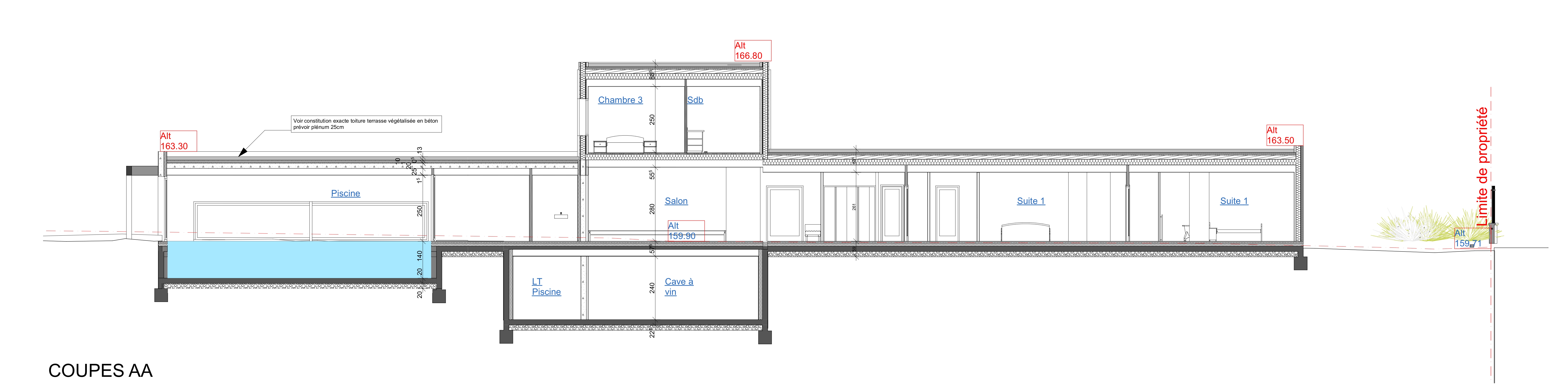 Descriptif technique : Le bâtiment est conçu en ossature bois Les façades extérieures seront revêtues (voir dessins des façades) a) Partiellement d’un enduit « ton pierre » des Ets PRB ou similaire b) Partiellement d’un bardage en lames de bois d’essence « red cedar » revêtues d’une lasure de « pré-grisaillement » offrant une homogénéité d’aspect pérenne Les toitures terrasses seront végétalisées et plantées de sédum Les menuiseries extérieures seront en aluminium (ou mixte bois-alu) de teinte Ral 7022 (gris terre d’ombre) ou similaire. Les terrasses du rez-de-chaussée seront constituées de lames de bois naturel VMC double flux Chauffage poêle à bois et gaz géothermie verticale