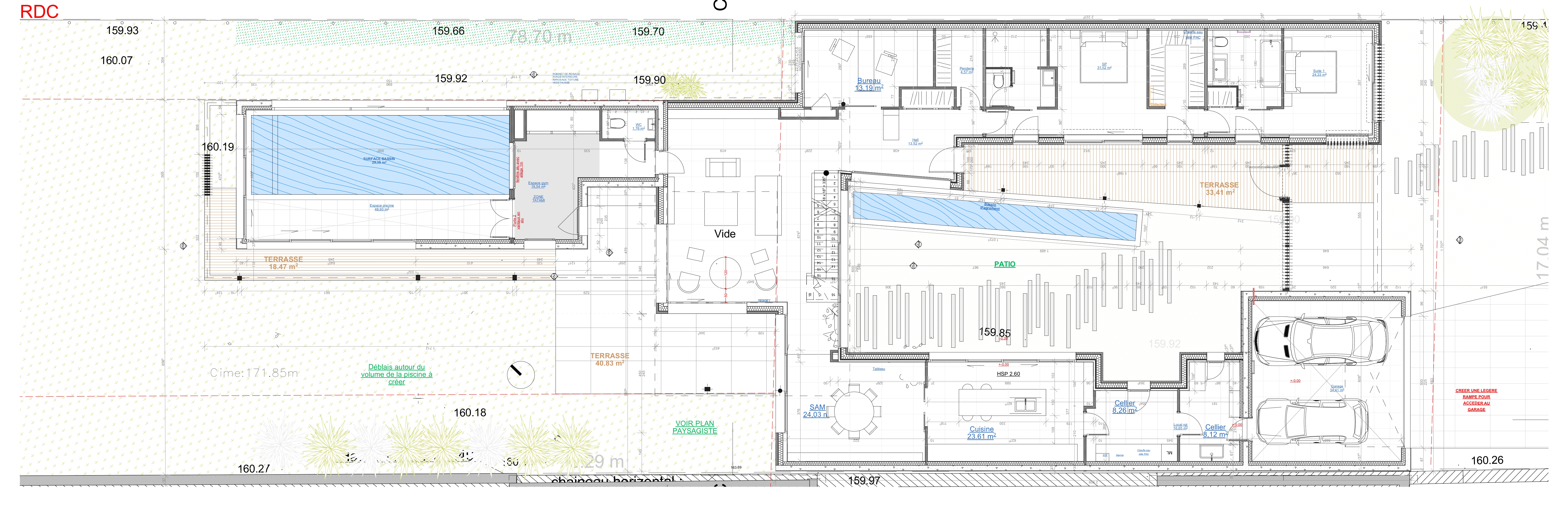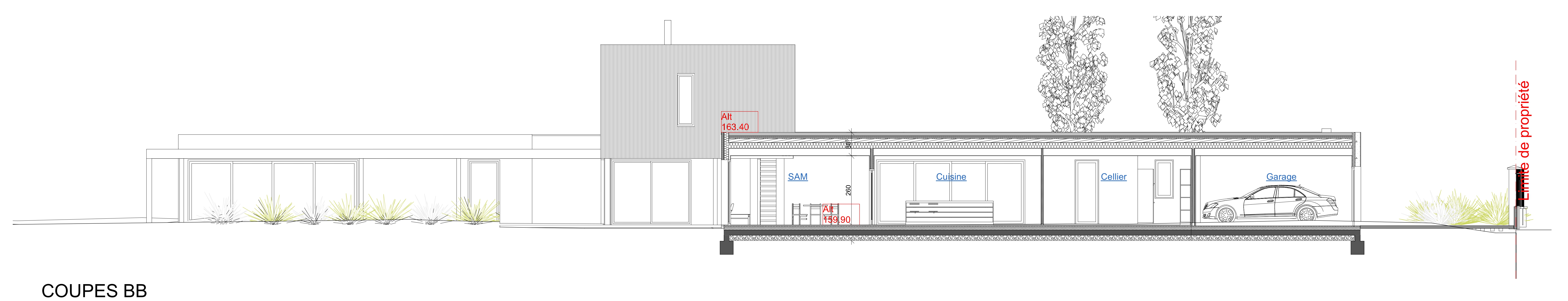 Le projet propose une architecture contemporaine respectueuse du site et à échelle maîtrisée. Une succession d’espaces et de filtres marquent une évolution depuis la rue vers l’intimité de la maison. Le traitement traditionnel de la clôture qui s’intègre à la lecture semi-urbaine de la rue laisse la place à un discret volume à rez de chaussée qui filtre des vues sur un patio ouvert sur le ciel, généreux et intime auquel on accède par un porche. Les volumes habitables occupent les limites séparatives pour laisser place à la végétation et au bassin d’agrément. Le cheminement se poursuit au-delà du patio, grâce aux transparences qu’offre le projet, pour découvrir le jardin au nord en partie bordé par le volume de la piscine qui s’avance dans le terrain et la zone boisée préservée en bout de parcelle L’étage qui abrite deux chambres représente un volume succinct qui profite d’une double orientation. Le bardage bois utilisé en partie sur les façades confère au projet de la légèreté et accentue l’insertion du projet au site. La lecture des volumes de la maison et de la piscine est soulignée par l’alternance des revêtements bois et enduits.