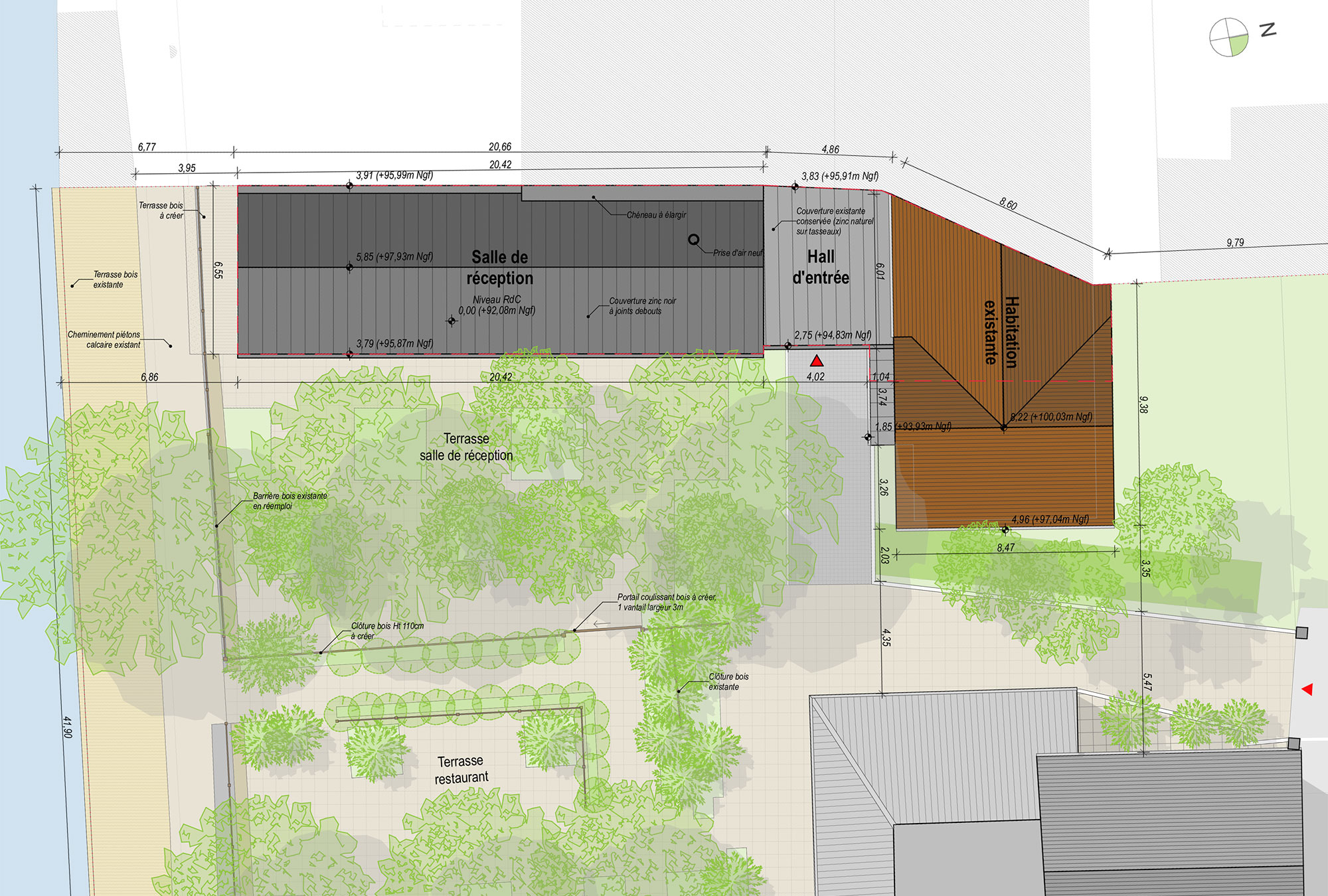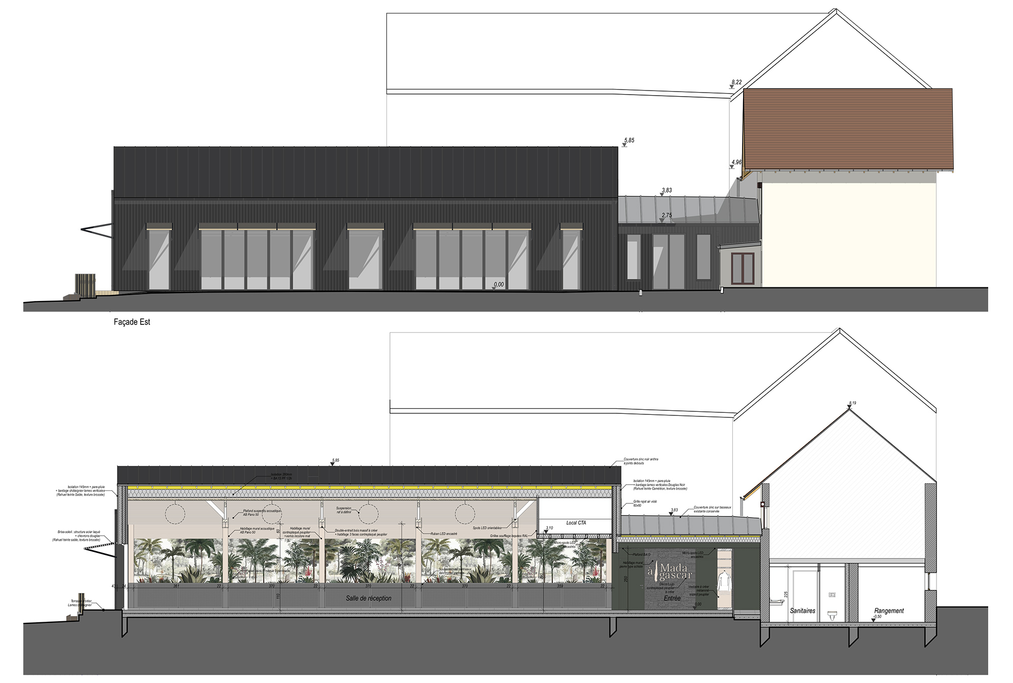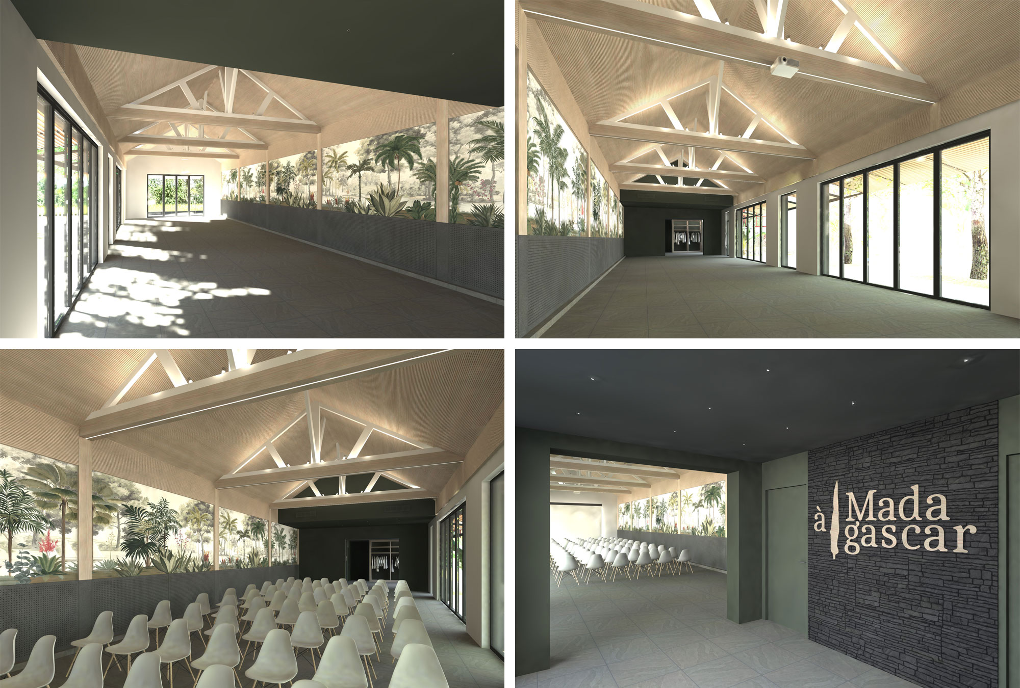 Le projet consistait et rénover et réaménager la salle de réception d’un restaurant situé aux bord du Loiret à Olivet. La salle s’ouvre généreusement sur une terrasse arborée et sur la rivière. Les façades ont été habillées par un bardage bois, dont la teinte noire met en valeur la végétation luxuriante du jardin existant. La mise en oeuvre d’une correction acoustique performante était un des enjeux du projet. Celle-ci a été réalisée par l’installation de panneaux en peuplier sous les rampants. La décoration évoque les voyages et les tropiques qui caractérisent l’image de ce restaurant.