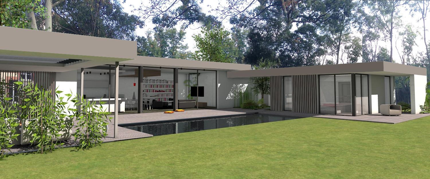 Sur cette parcelle urbaine, nous avons cherché à créer un petit cocon très intime pour la terrasse et la piscine en implantant la maison en C. De plain pied, elle offre à toutes les pièces principales et à toutes les chambres un accès direct au jardin. Quasiment tous les arbres de la parcelle ont été conservés. De ce fait, un platane a l'entrée de la parcelle traverse le toit terrasse. L'effet intérieur extérieur est maximisé par les baies toutes hauteur et les seuils encastrés. Pour se fondre dans l'environnement boisé, les bandeaux des toits terrasses sont recouverts d'aluminium gris vert.