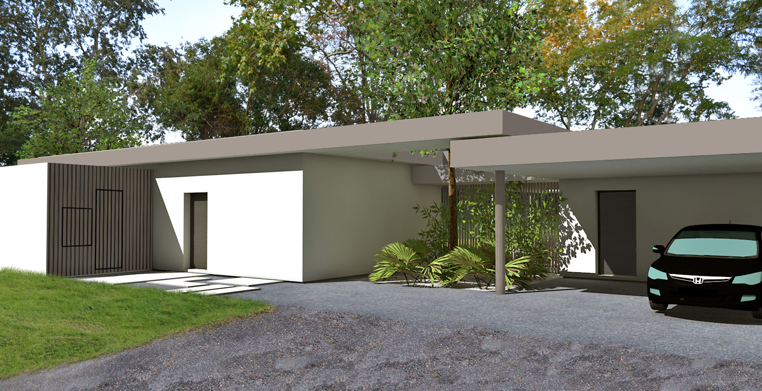 Descriptif technique : - Murs et toit terrasse ossature et charpente bois - Couverture en zinc (à très faible pente, cachée) - Au sol : Dalle béton sur vide sanitaire - Menuiseries alu + brise soleil alu - Terrasse bois - ITE + enduit sur 80% de la façade, bardage bois saturé sur 20% NF Maison Individuelle